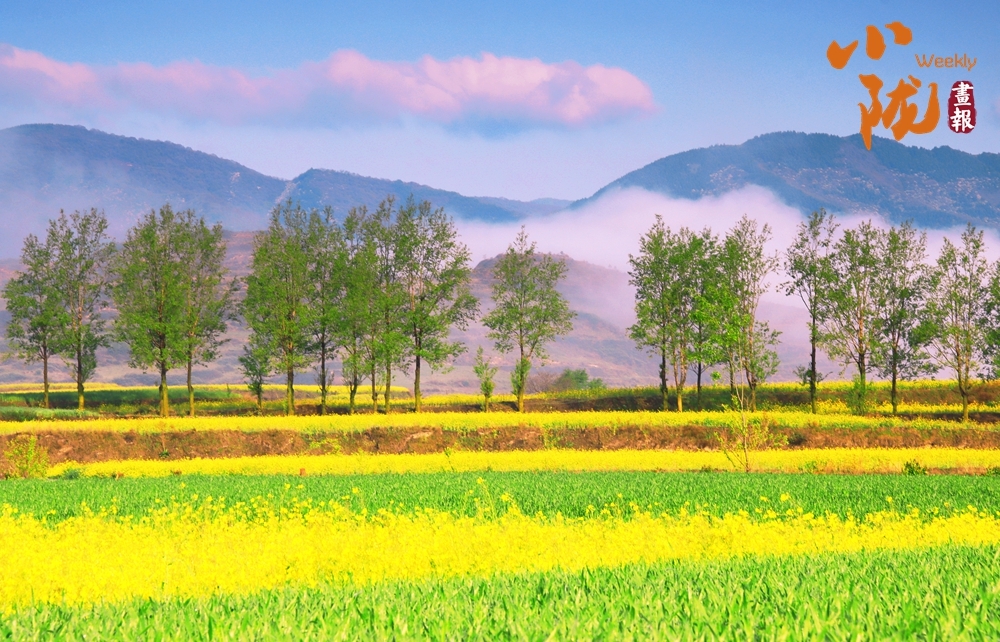 澄澈的蓝天衔着粉紫流云,眼前是望不到头的油菜花田,明黄的花浪在风里翻涌,田埂边的树木抽出嫩绿新芽,春日的鲜活与灵动,全在这山野间漾开。