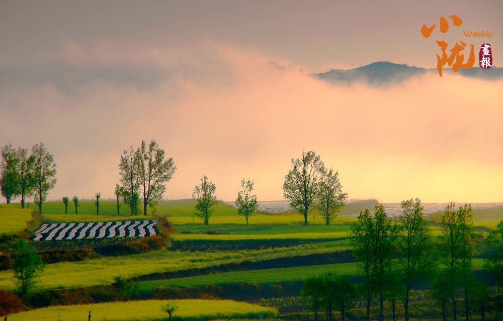 晨雾为华亭的春景蒙上柔纱,远山在霞光里若隐若现。层层梯田铺展着嫩绿与明黄,田垄间覆着的条纹地膜泛着细光,疏朗的树木错落点缀,一派朦胧又鲜活的春野意趣。