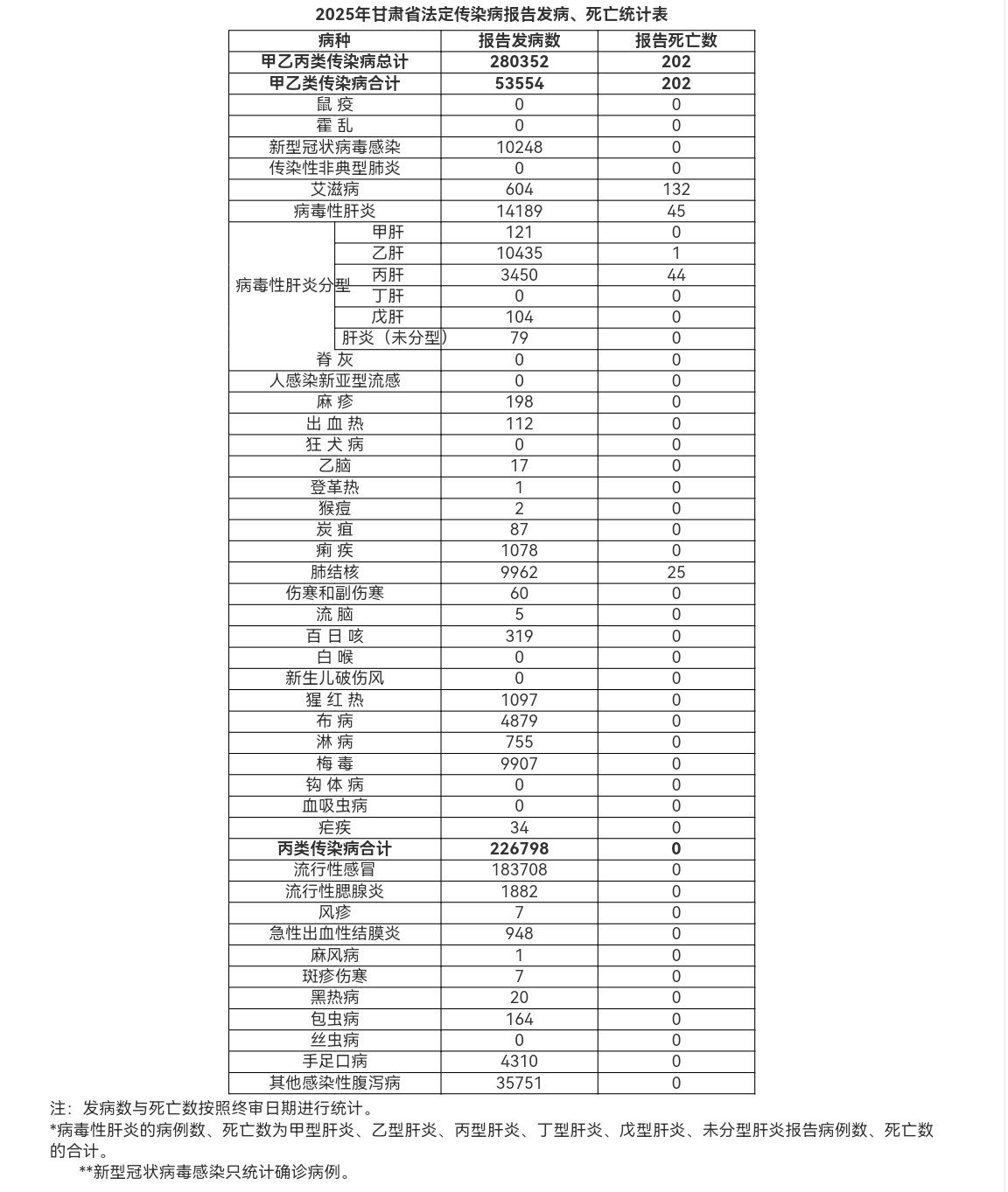 2025年,全省无甲类法定传染病报告;报告乙类传染病19种53554例,报告发病率217.87/10万,死亡202例,报告死亡率0.82/10万,病死率0.38%,报告发病率较2024年下降21.31%;报告丙类传染病10种226798例,报告发病率922.68/10万,无死亡病例报告,报告发病率较2024年上升49.15%。