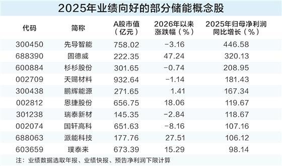 从业绩来看,据证券时报·数据宝统计,按照2025年年报、业绩快报、预告归母净利润下限(若无下限则取公告数值)计算,2025年归母净利润同比增长(含扭亏为盈)的储能概念股有23只。4股归母净利润扭亏为盈,分别为恩捷股份、杉杉股份、鹏辉能源、固德威。