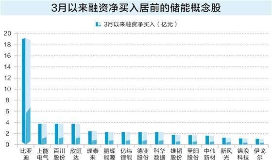 资金层面,据数据宝统计,截至3月31日收盘,3月以来融资净买入超1亿元的储能概念股有15只,如比亚迪、上能电气、百川股份、欣旺达、璞泰来等。