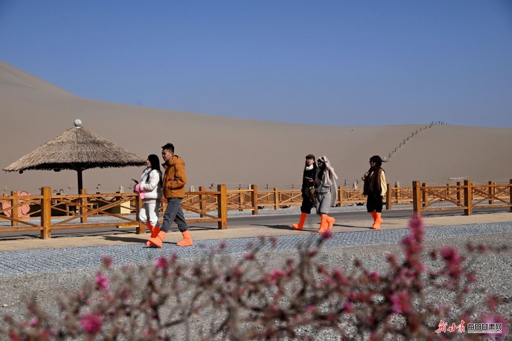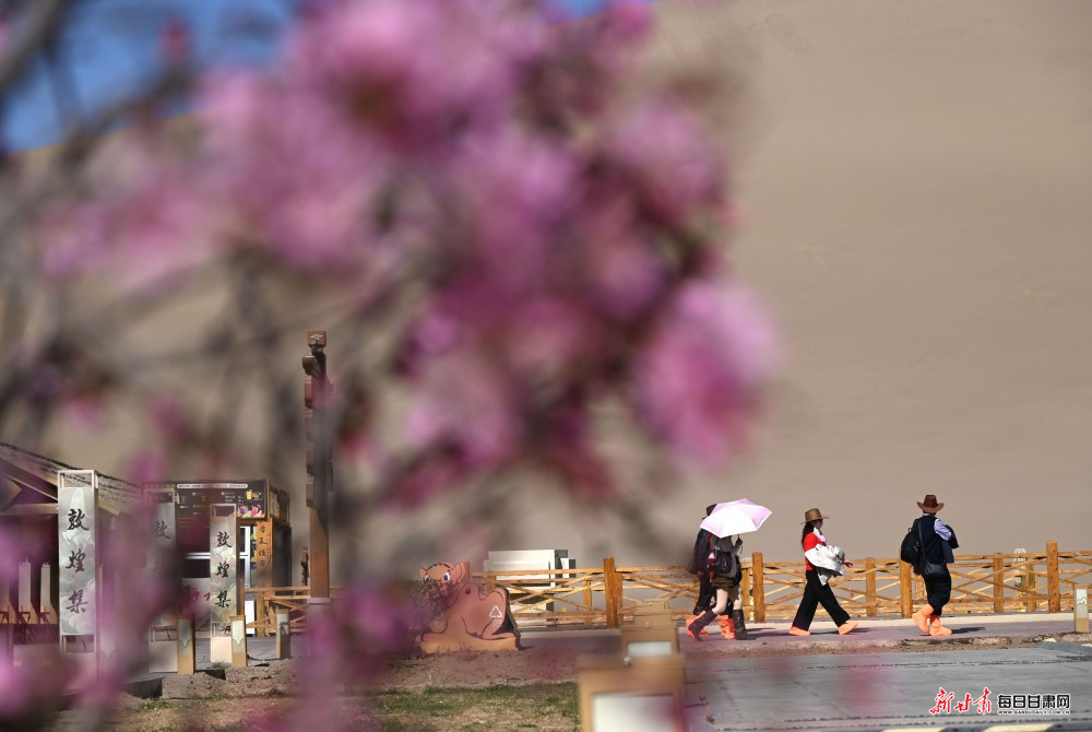 春光明媚的三月,敦煌旅游市场持续升温。在鸣沙山月牙泉景区,游客迎着和煦春风,漫步大漠,远眺沙山,近赏清泉,尽情领略雄奇壮阔的大漠风光,沉浸式体验丝路风情,感受千年文化底蕴。春日暖阳下,杏花盛放,骆驼列队穿行,大漠灵泉与繁花相映成趣,勾勒出一幅独具敦煌韵味的春日画卷。