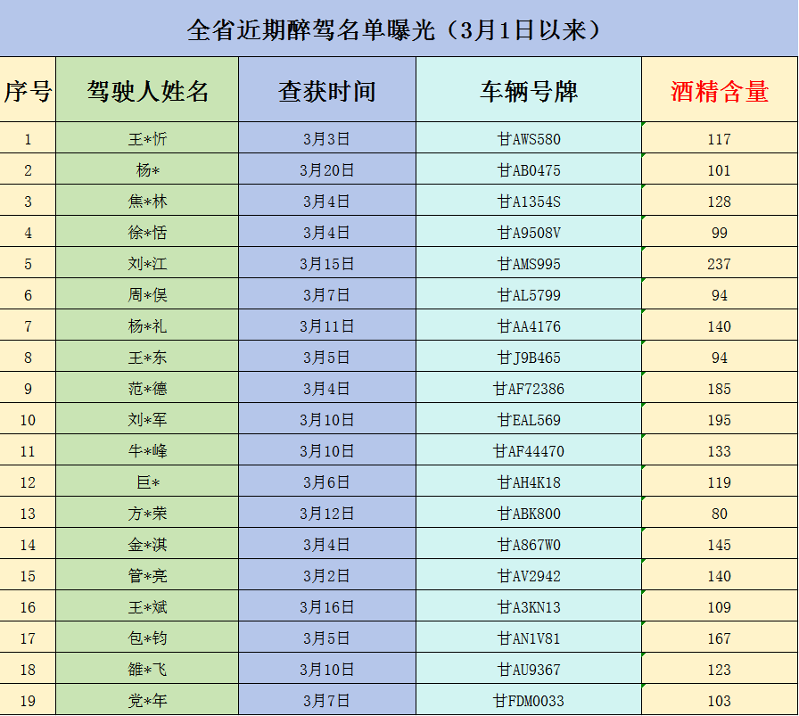 现将近期查获的酒驾人员名单