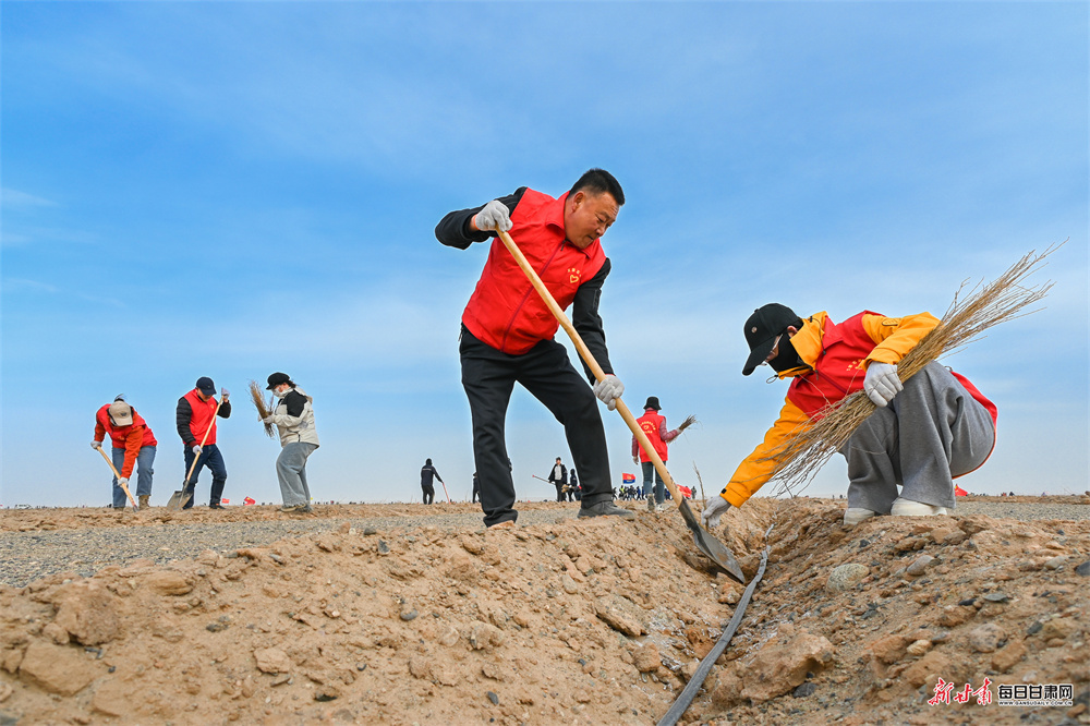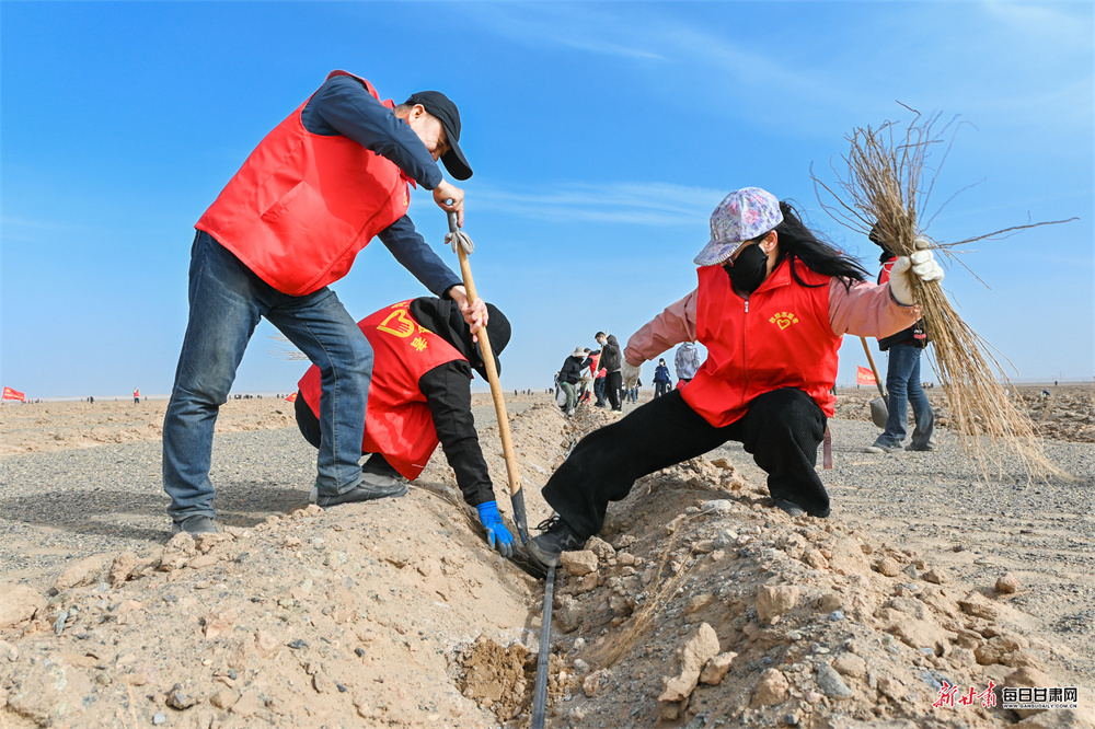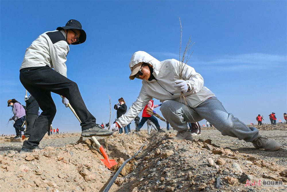 仲春时节,敦煌戈壁荒滩上掀起植树造林热潮,干部群众携手播绿,全力筑牢西部生态安全屏障。