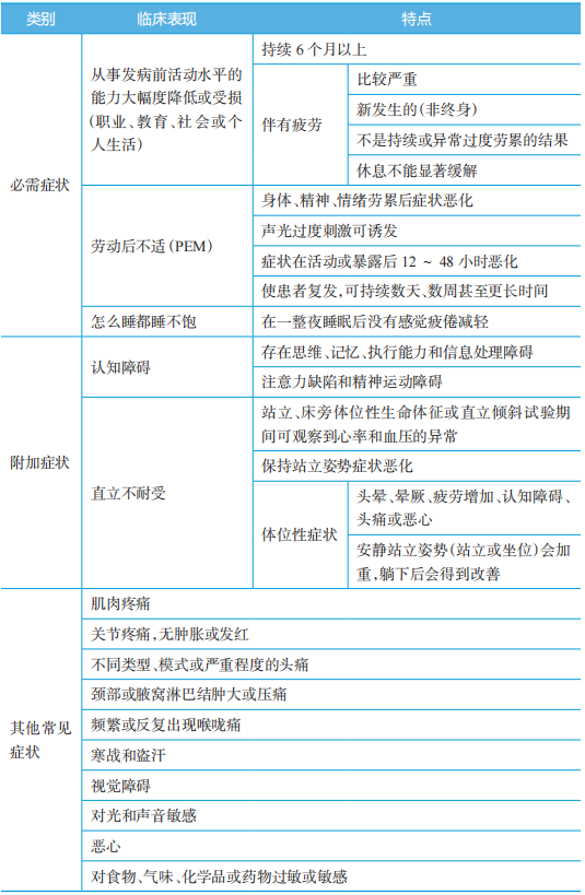 有。目前,该病临床常用的诊断标准是2015年美国医学研究所提出的IOM诊断标准:诊断需要3种必需症状和2种附加表现中的至少1种;症状持续至少6个月,且至少有一半的时间达到中度、中重度或重度。可通过表1对慢性疲劳综合征患者进行初步评估。