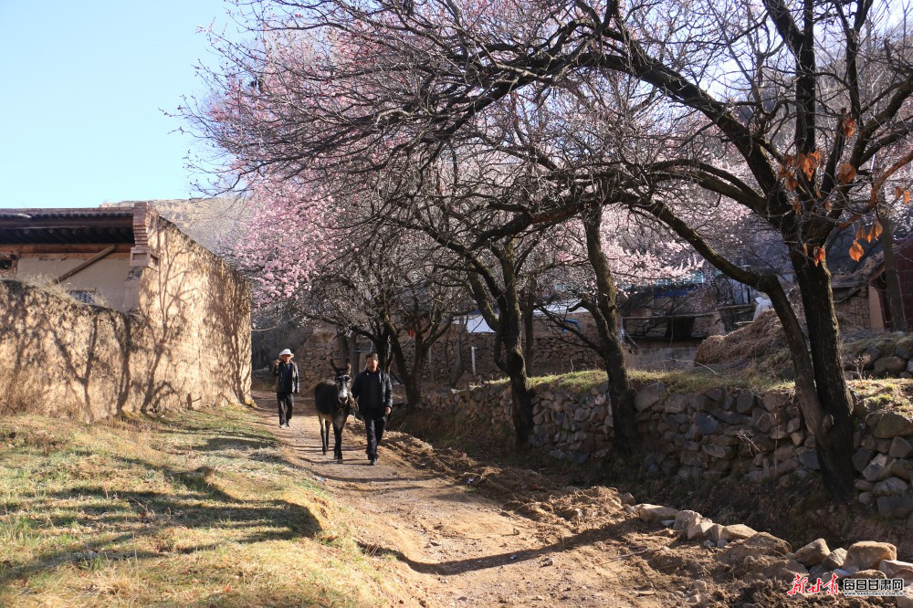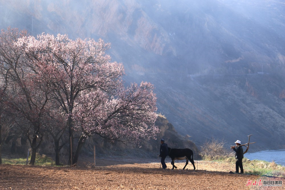 烂漫杏花与错落有致的民居、蜿蜒流淌的洮水相互映衬,勾勒出一幅秀美灵动的乡村春日画卷。