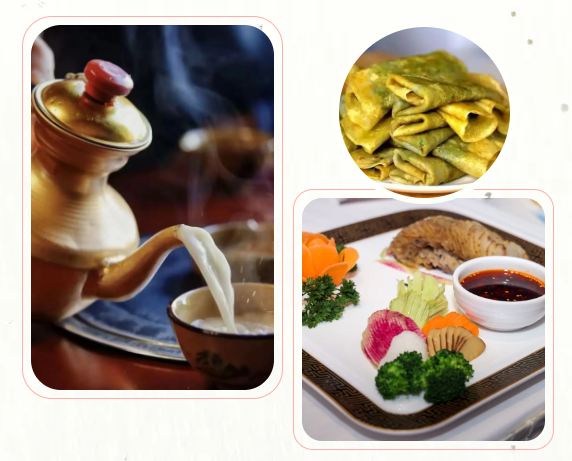 以牛羊鸡、腊猪头和萱麻口袋、牦牛酸奶、鹿角菜、柳花菜地方食材为主,品尝具有乡土味道、民族特色的“牛头宴”、“藏家特色烤全羊”、土坑烤鸡、手抓羊肉、野山菌炒小鸡、炕锅土豆片、凉拌苦苦菜、炝野葱花手擀面、土城牦牛酸奶等美食。