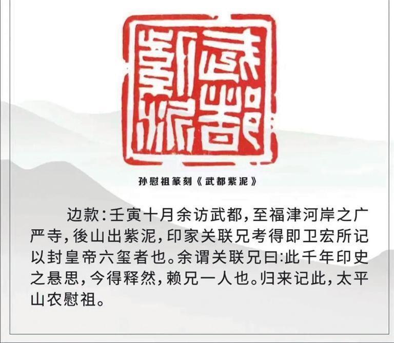西泠印社副社长、古代封泥研究专家孙慰祖,在其《封泥发现与研究》一书中指出:“汉代封泥高下有别,武都紫泥为皇帝专用。”并在实地参观关联篆刻艺术展后深受触动,创作篆刻作品《武都紫泥》并撰写记文。该作品在西泠印社权威刊物发表后,引发热烈反响。