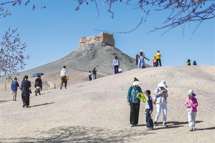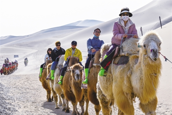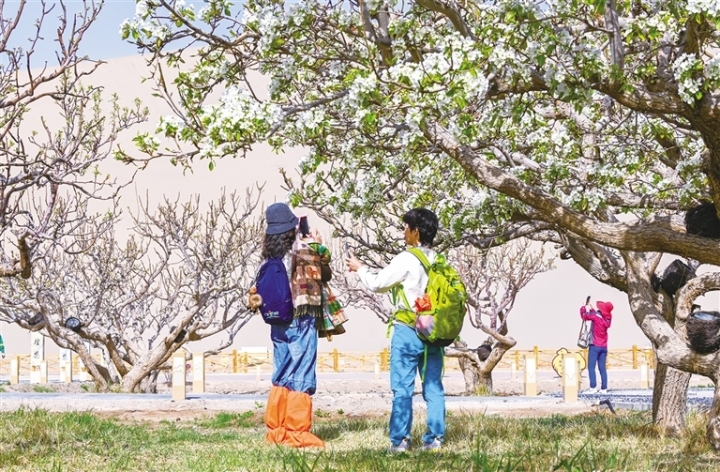 清明小长假,敦煌迎来旅游热潮。鸣沙山月牙泉景区内,梨花、桃花竞相绽放,游客骑乘骆驼穿梭沙海,尽享丝路风情;在莫高窟,参观队伍井然有序,游客探寻千年壁画的艺术密码。阳关玉门关景区推出通关文牒、诗词挑战等沉浸式体验,吸引众多游客。此外,不少人走进博物馆,感受敦煌文化魅力。