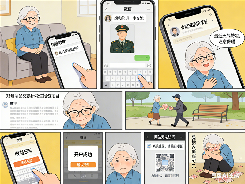 中国甘肃网4月9日讯(西北角·中国甘肃网记者 程健 实习生 马文博)近日,兰州市城关区72岁的纪奶奶(化名)遭遇一起“情感+投资”复合型电信网络诈骗,毕生积攒的386万余元被骗子悉数卷走。骗子以诗歌朗诵软件为突破口,凭借“声音好听”的夸赞搭建情感桥梁,伪装军人身份设诱导投资,最终通过线上转账+线下现金交易的方式,将老人的养老钱骗得一干二净,其套路之深、金额之大令人触目惊心。目前,相关案件正在进一步侦办中。