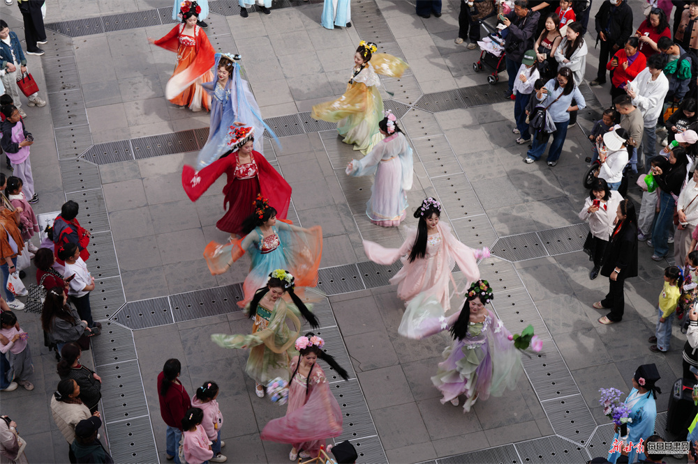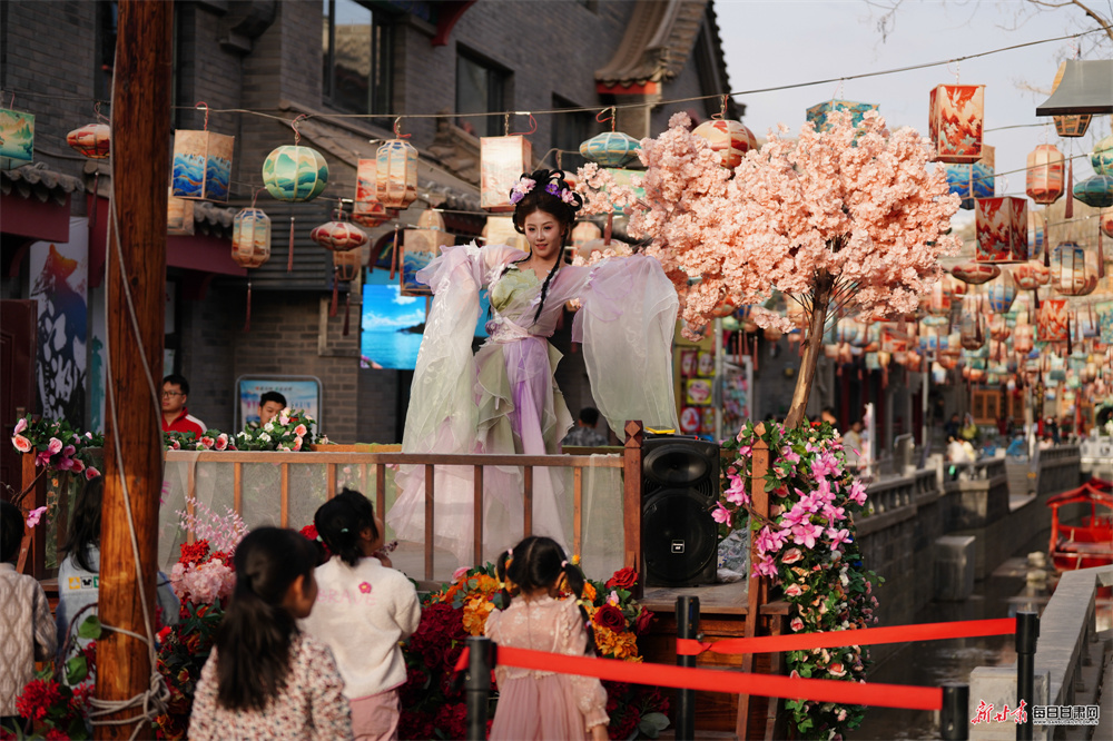 活动期间,十二花神踏春巡游,身姿翩跹穿行于古巷花间,尽显国风雅致韵味;古彩戏法、花朝踏歌等特色民俗节目轮番上演,传统非遗技艺与国风歌舞相得益彰,为游客带来精彩纷呈的视听盛宴。青砖黛瓦映繁花,春水潋滟泛波光,众多汉服爱好者身着传统盛装赴约,衣袂翩跹、古韵悠悠,成为老街里一道亮丽的春日风景线,整条街巷处处洋溢着浪漫雅致的国风氛围。