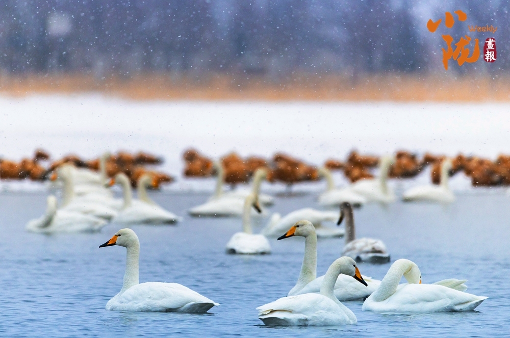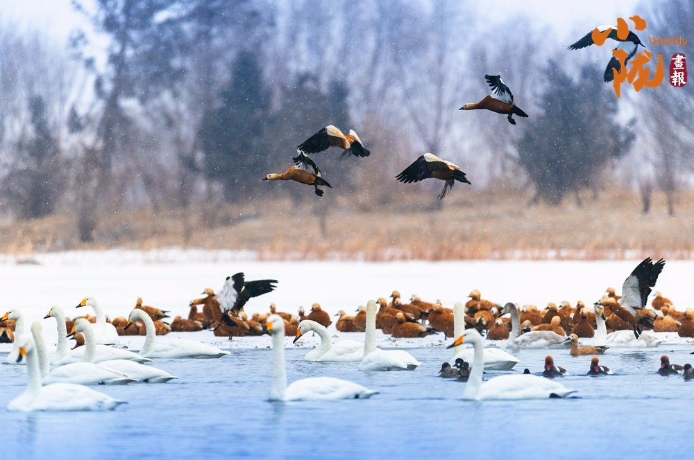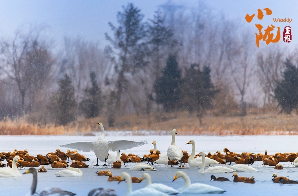 天鹅舒展着洁白羽翼,或立于冰面,或游弋水中,棕褐赤麻鸭相随不离。远山林木朦胧,飞雪轻扬,这群生灵为寒寂天地注入灵动暖意,冰水之间生机盎然,尽显自然野趣。