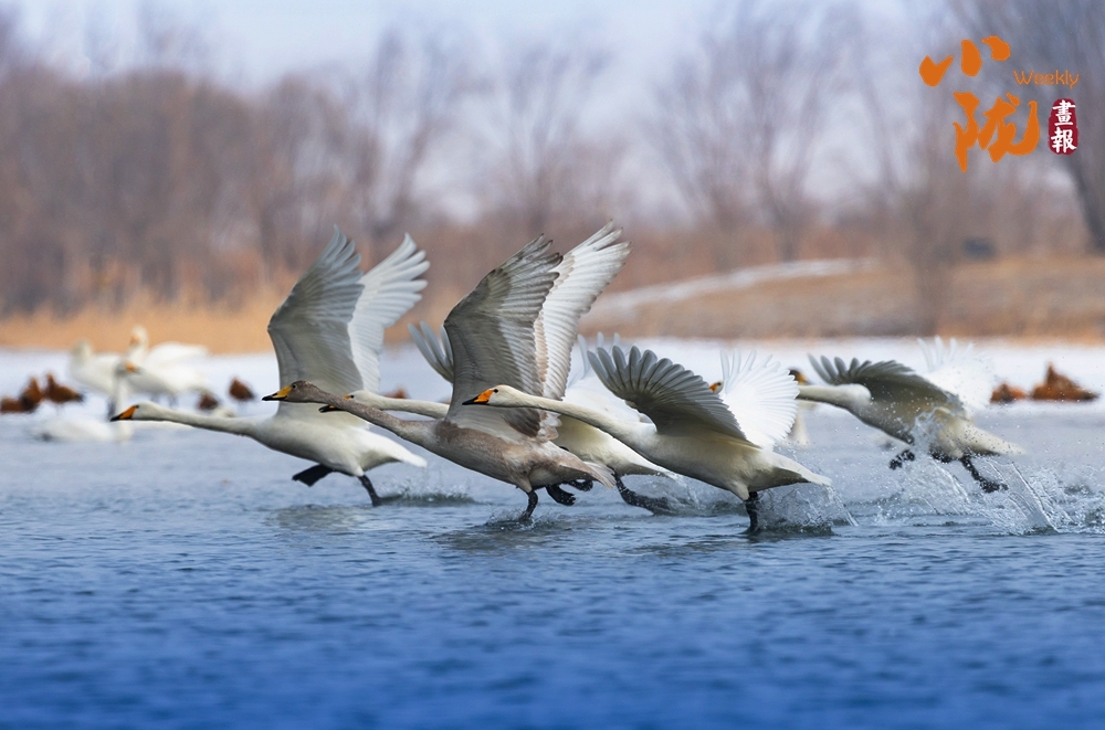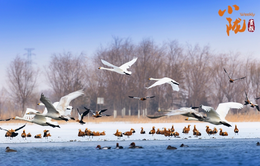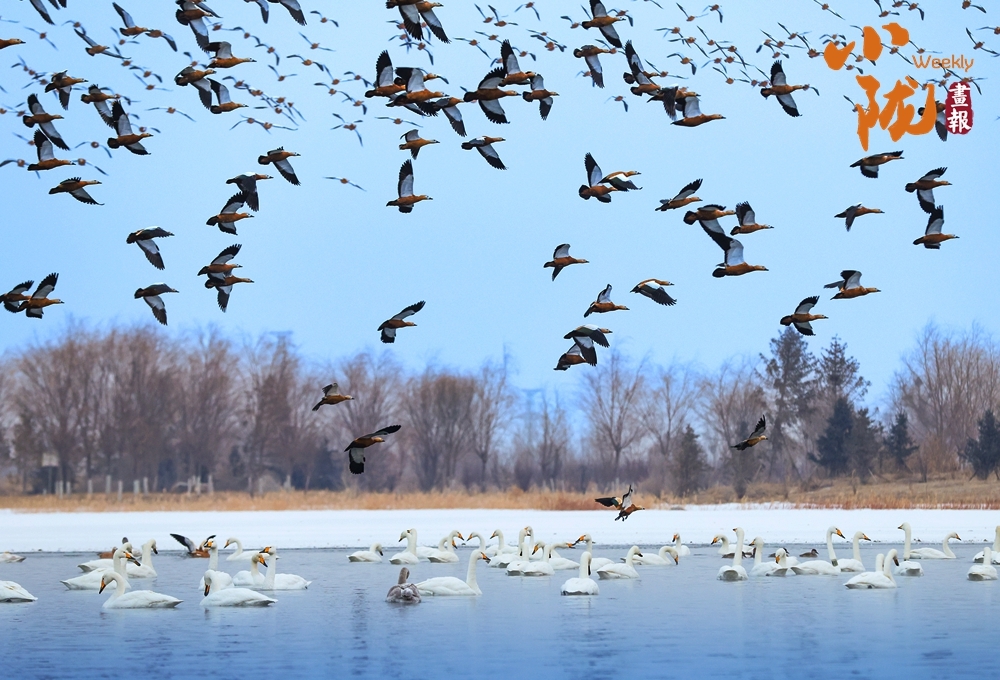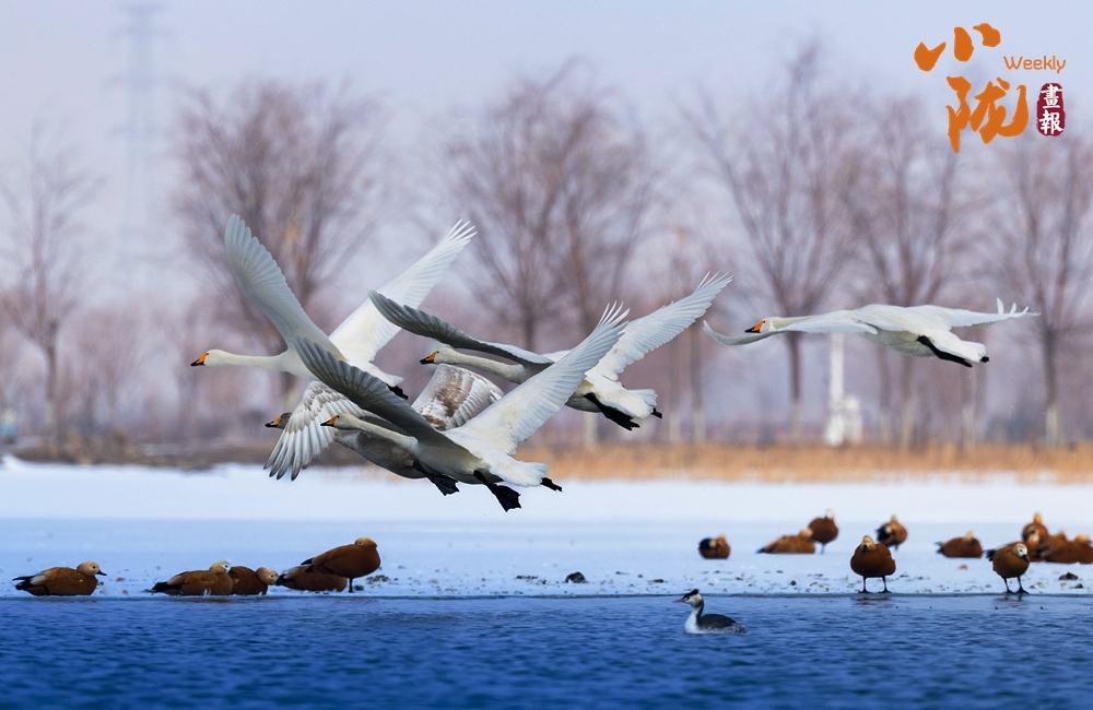 天鹅正振翅欲飞,洁白羽翼拍起水花,橙黄喙部在冷调天地间格外醒目。它们或踏波而起,或整队待发,身旁的赤麻鸭或静栖或随飞,为春日添上一抹蓬勃的生机。
