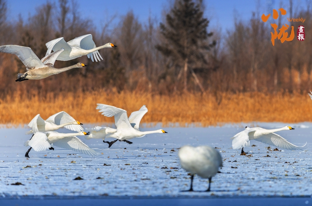 这群优雅的天鹅如同大自然的芭蕾舞者,它们是春日的序曲,或齐聚踏冰、振翅高飞,或三五成群、成双成对,时而发出清亮高亢的鸣叫,唤醒了沉睡了一冬的芦苇荡。