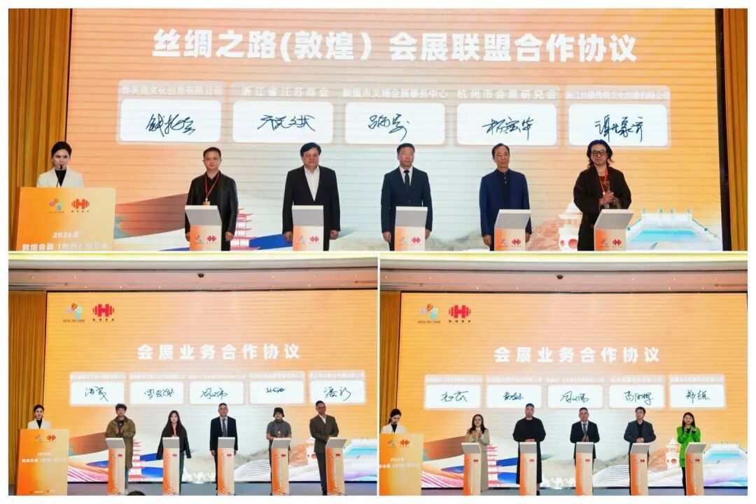 现场举行两场集中签约:敦煌市文博会展事务中心、敦煌市广至传媒会展有限责任公司分别与多家浙企签订丝绸之路(敦煌)会展联盟合作协议和会展业务合作协议,覆盖文旅活动、数字会展、IP运营、品牌传播等多个领域,为敦煌会展注入长三角优质资源与创新动能。