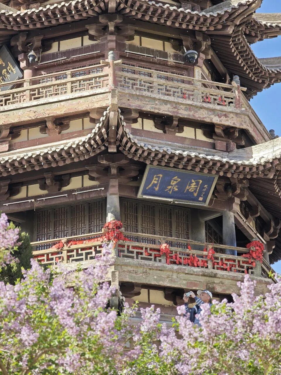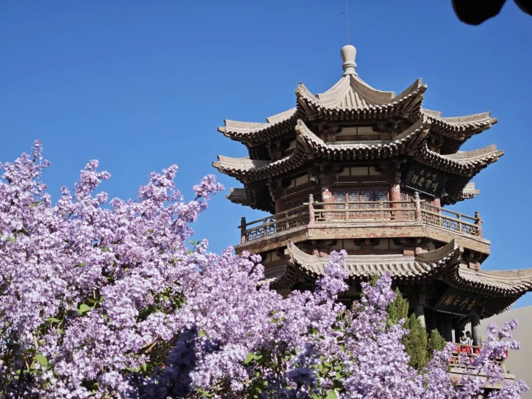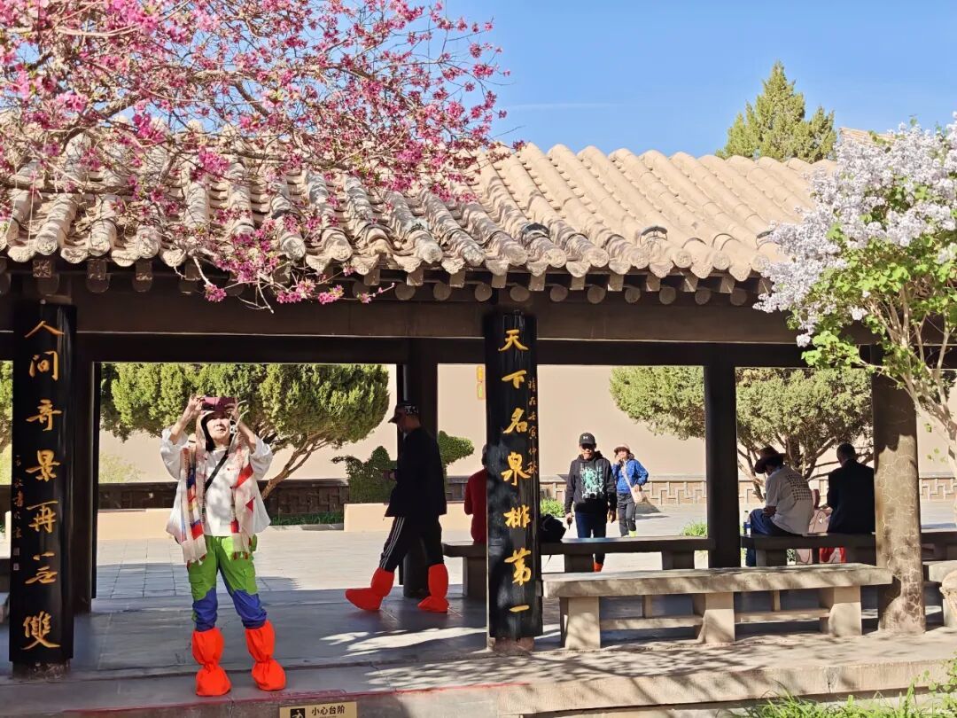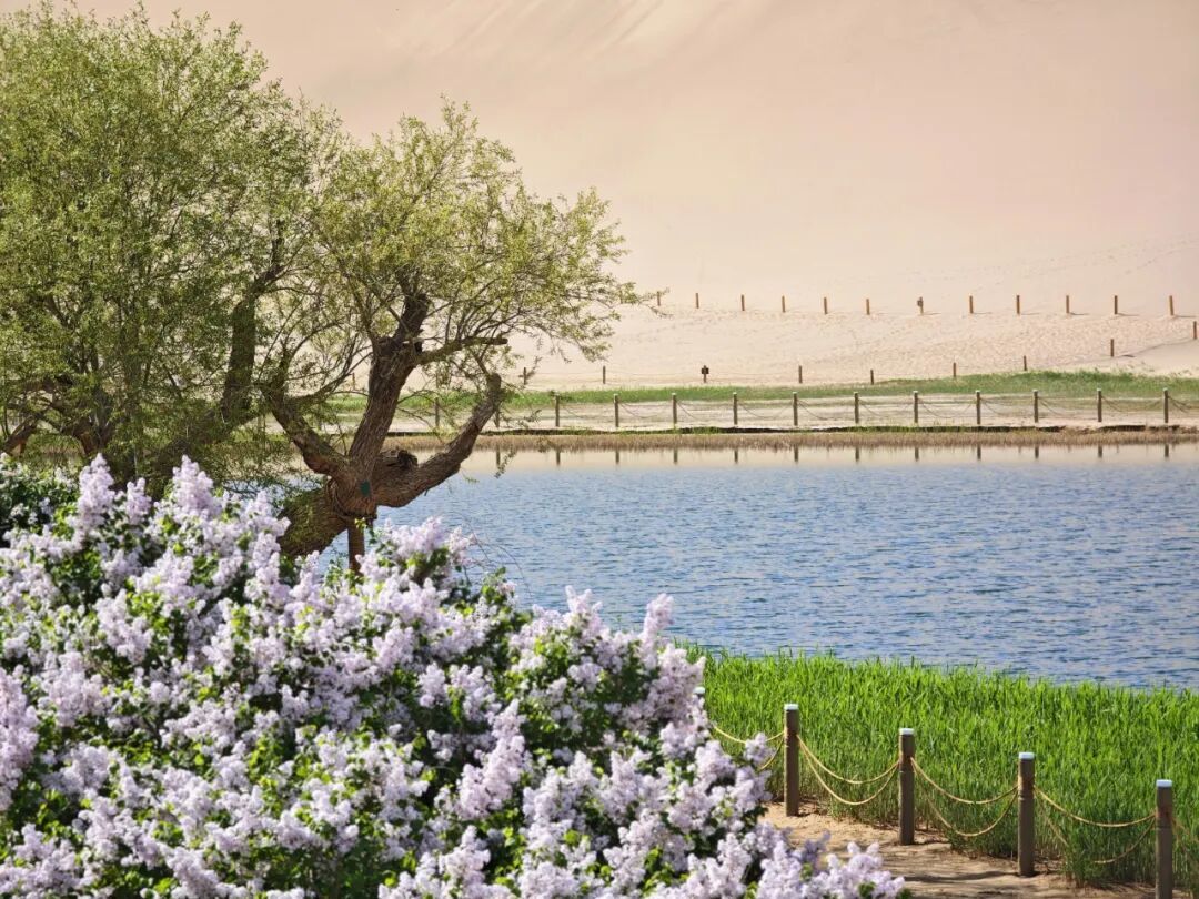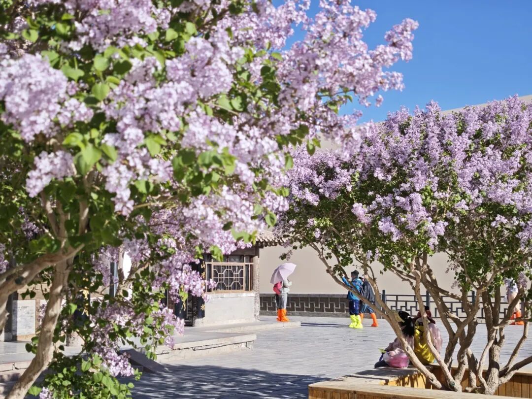 月泉阁旁,淡紫丁香悄然绽放,一簇簇缀在枝头,似紫色云霞,温柔雅致。丁香的淡紫不张扬,却与金沙、蓝泉相映,让春日色彩更显丰富。微风拂过,暗香漫溢,混着沙粒与花香,为沙泉秘境添了几分诗意,让游客忍不住停留拍照。