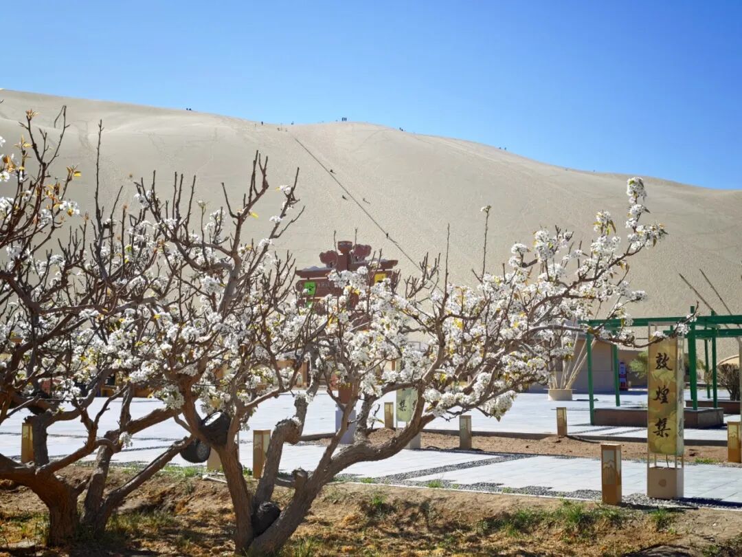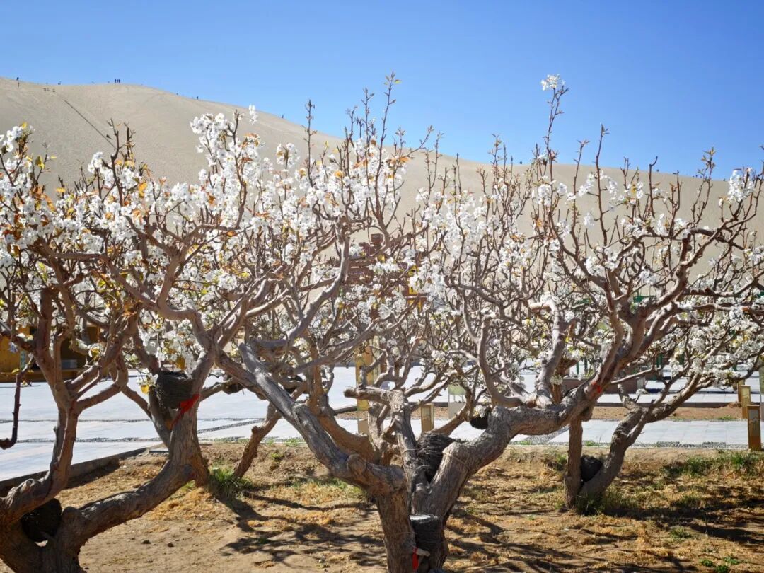 莹白的梨花,是春日最清雅的点缀。春日渐深,梨花次第绽放,洁白花瓣如素雪覆枝,纯净无杂,在阳光下格外动人。枝头缀满白花,与鸣沙山相映,褪去大漠苍茫,多了几分清绝。风过花瓣轻扬,落在沙上、泉边,与粉杏、金沙、蓝泉相映成趣,淡淡梨香沁人心脾,让人忘却喧嚣。