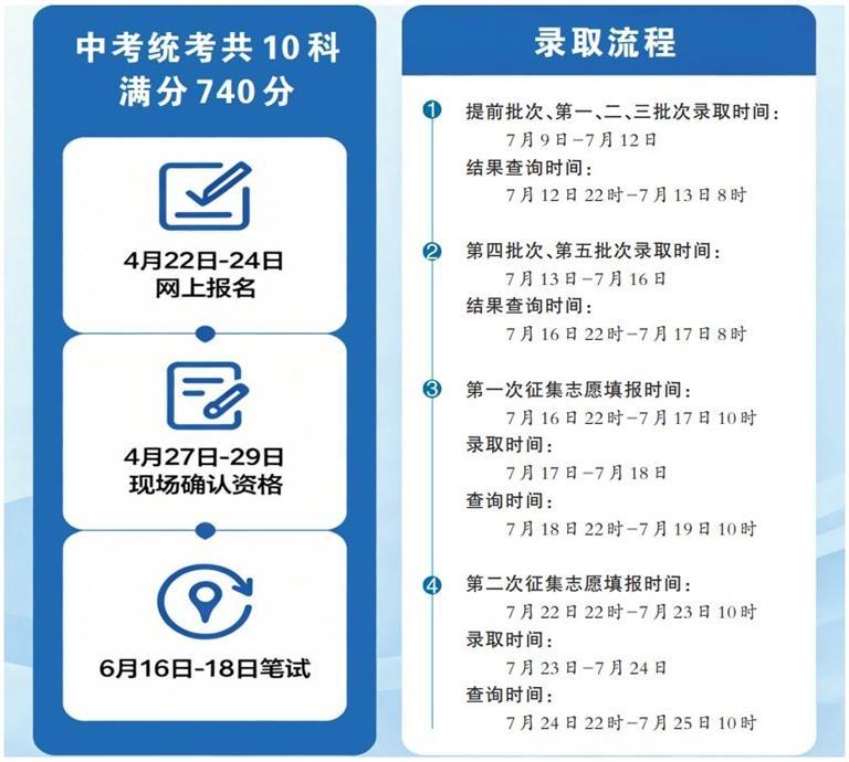中考各项日程安排已全部确定:4月22日至4月24日开展网上报名、填报志愿,4月27日至4月29日现场确认报名资格。6月16日至18日进行统一考试科目笔试,7月3日公布中考成绩和普通高中录取最低控制线,后续按批次开展普通高中招生录取工作。