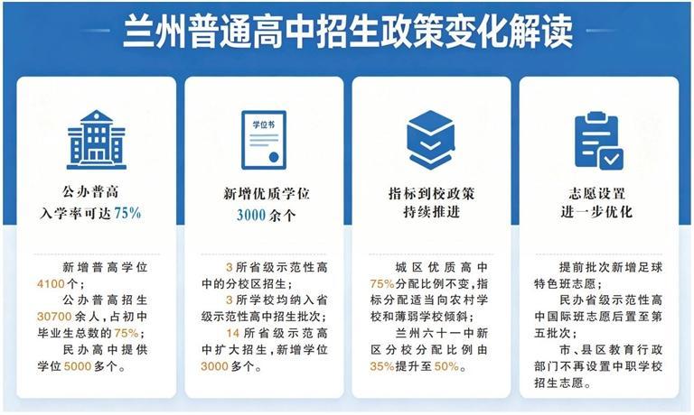 聚焦考生和家长关切,通过增加选项、优化次序,调整了志愿设置。一是在提前批次中增加足球人才培养改革试点特色班志愿(即兰州三十三中足球人才培养改革试点特色班),对口招收3所试点初中的推荐生源以及市内符合条件的其他足球人才生源,为足球特长学生增加更多选择机会;二是将民办省级示范性高中国际班(兰州东方中学国际班)的志愿从第二、三批次后置到第五批次民办高中志愿进行招生,更有利于考生和家长稳妥选择;三是根据省教育厅通知要求,2026年起,市、县区教育行政部门不再设置中职学校招生志愿,中职学校的招生录取工作由甘肃省教育厅统一组织,纳入全省统一招生平台进行,进一步扩大了有意就读中职学校学生和家长的选择范围。