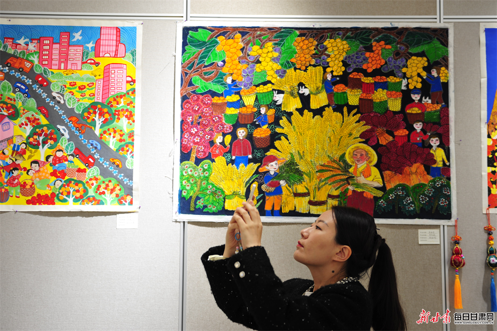作品均出自农民创作者、非遗代表性传承人及乡土艺术爱好者之手。从《静宁苹果香飘海外》的丰收欢腾,到《黄河之滨也很美》的生态之美;从浓烈饱满的色彩构图,到质朴真挚的生活表达,一幅幅作品生动呈现了陇原农耕文明的深厚底蕴与新时代乡村振兴的蓬勃图景。