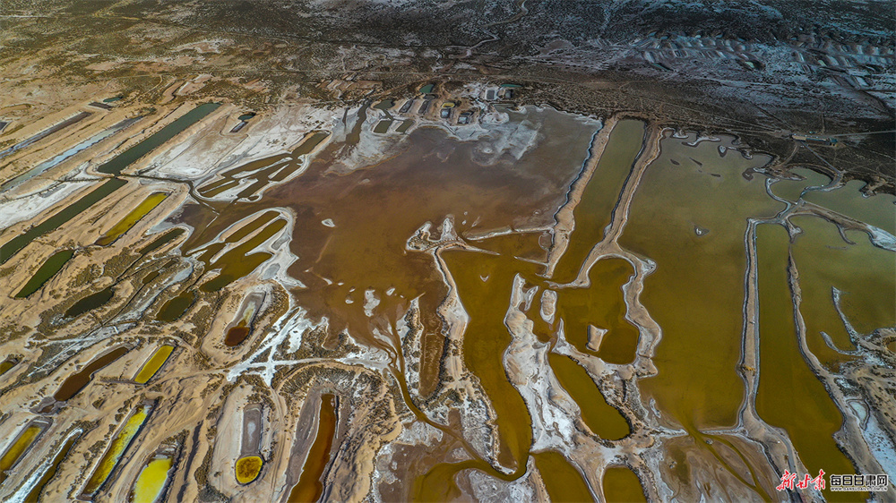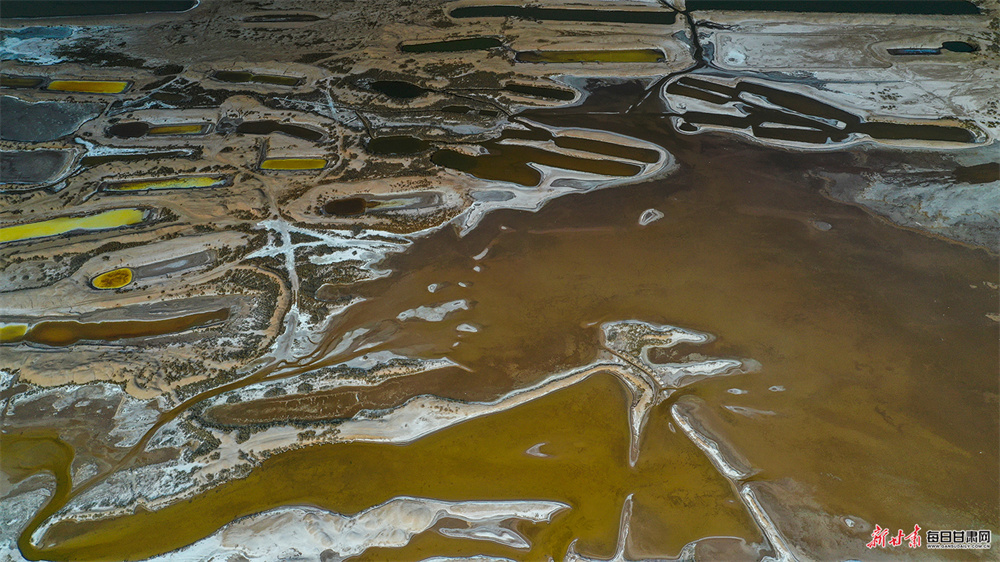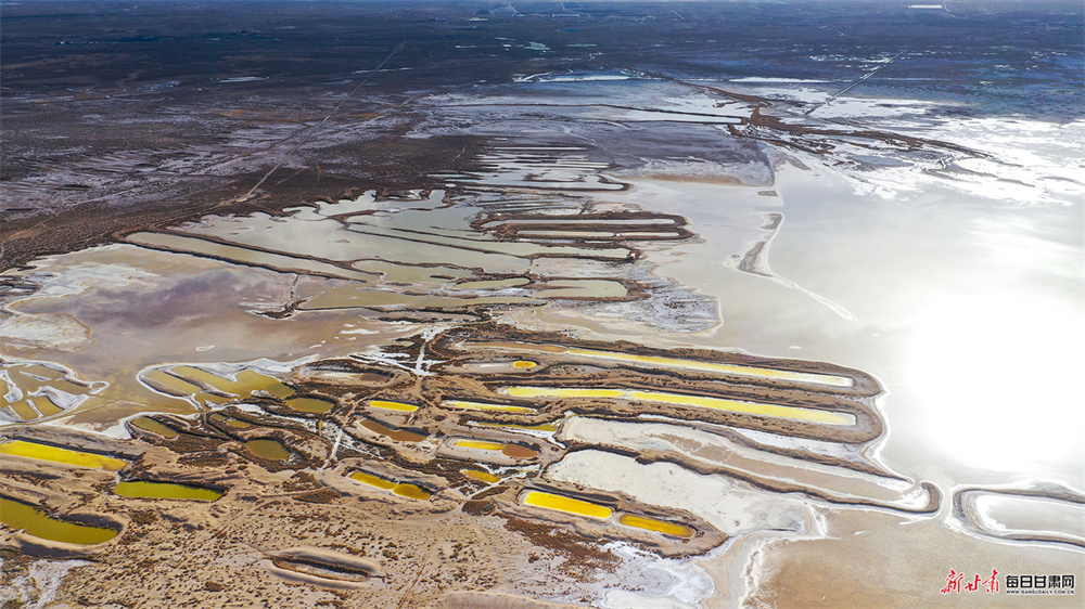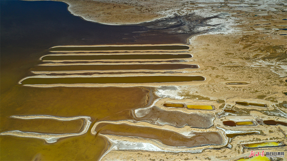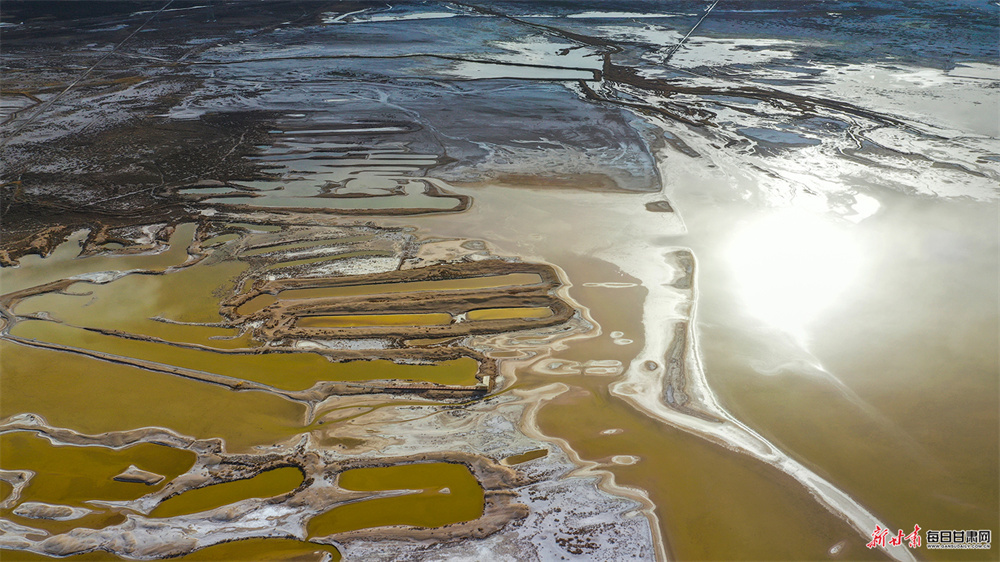 夕阳斜照,古盐田与盐生植物宛若覆雪,白润泛黄;盐池水面光影流转,如田黄玛瑙般温润剔透。形态各异的盐田或规整成条,或形似鸟兽,浑然天成,尽显大自然的鬼斧神工。