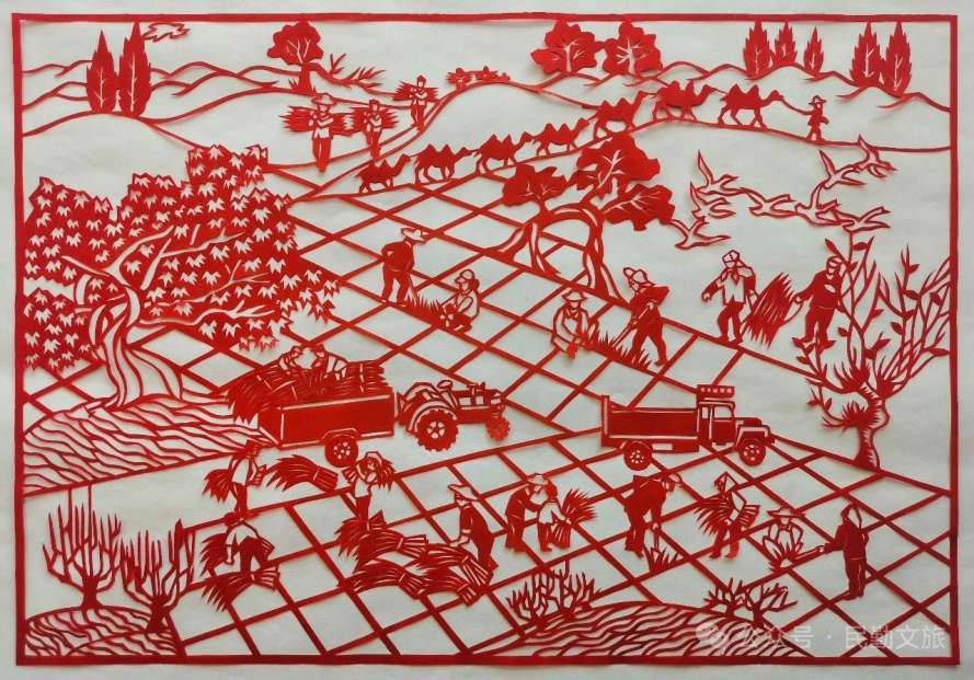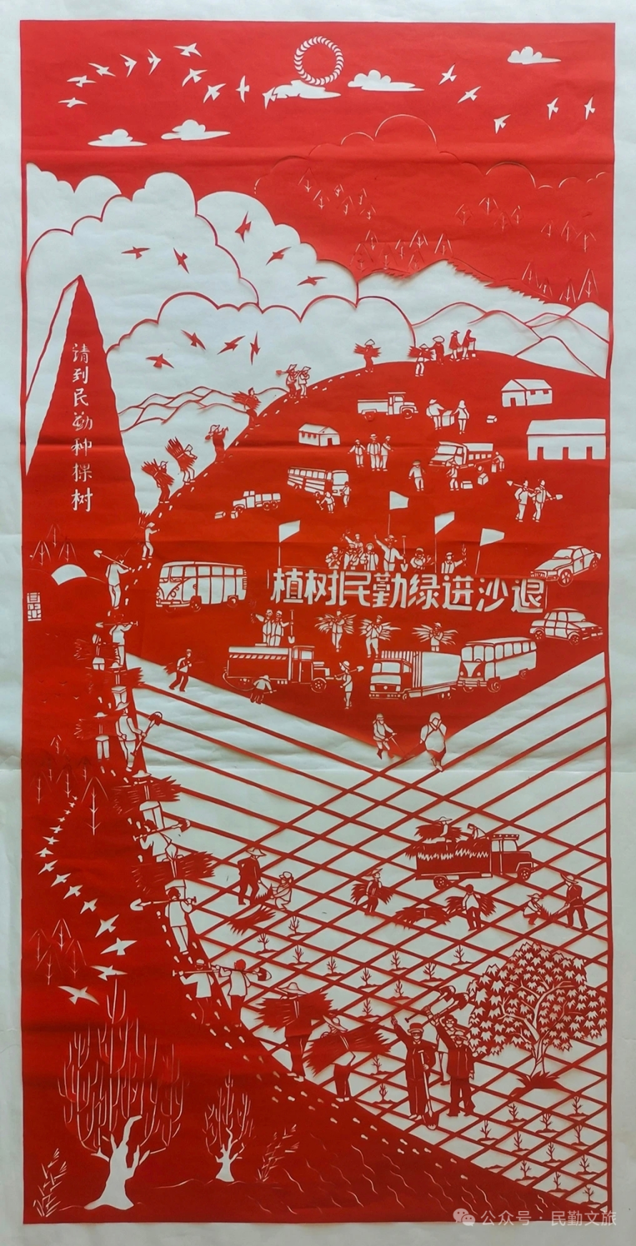 甘正业以传统剪纸手法,将当地“沙退绿进”的生态实践定格于红纸之上。作品包括《共栽一棵树 同守一片绿》《绿染民勤》等,生动刻画了各地志愿者齐聚民勤,在沙漠中挥锹挖坑、扶苗培土、提水浇灌的场景。