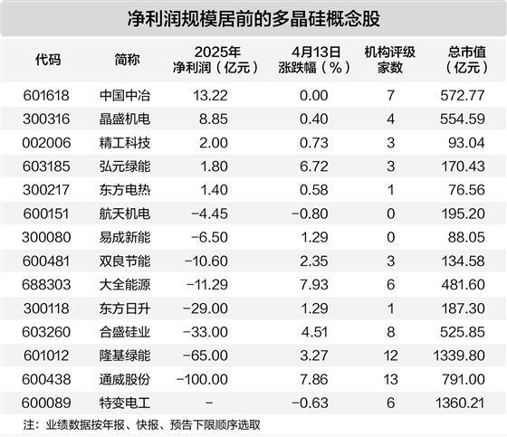 据证券时报·数据宝统计,A股中布局多晶硅产业链的个股共有14只,其中13只已披露2025年业绩相关数据,净利润按年报、快报、预告下限统计,有5股2025年度有望实现盈利,中国中冶、晶盛机电、精工科技的净利润金额居前,均超过2亿元。