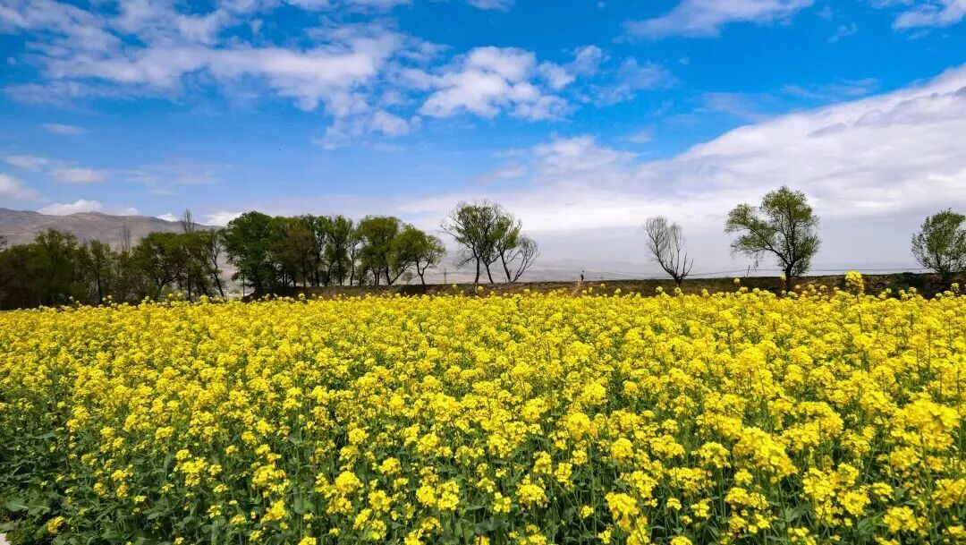 在天水市武山县,因各乡镇海拔不同、开花周期各异,这片金色的海洋呈渐进式铺展,从河谷川地一直蔓延到高山梯田,与村庄、河流、青绿的麦苗交相辉映,构成一幅色彩斑斓的绝美田园风光图。