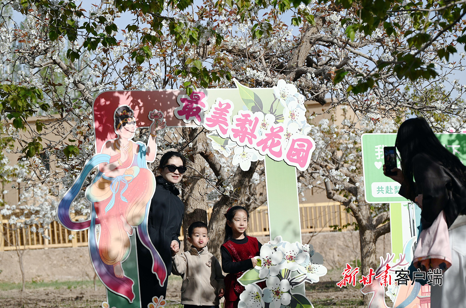 2026年4月11日,游客在敦煌市莫高镇莫高村的梨园中游玩。日前,位于三危山下的莫高镇千亩梨花竞相绽放,当地举办丰富多彩的文化活动,吸引游客踏青赏花、乐享春光。