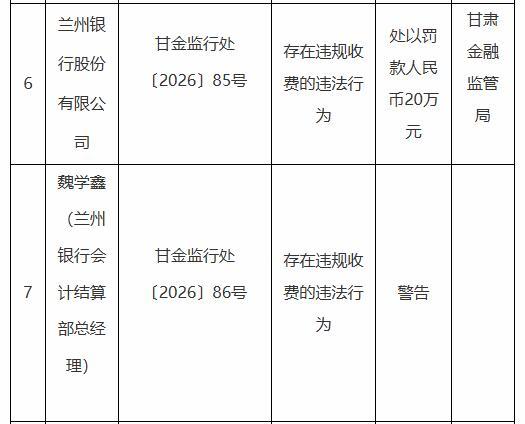 甘金监行处〔2026〕86号显示,魏学鑫(兰州银行会计结算部总经理)被警告。