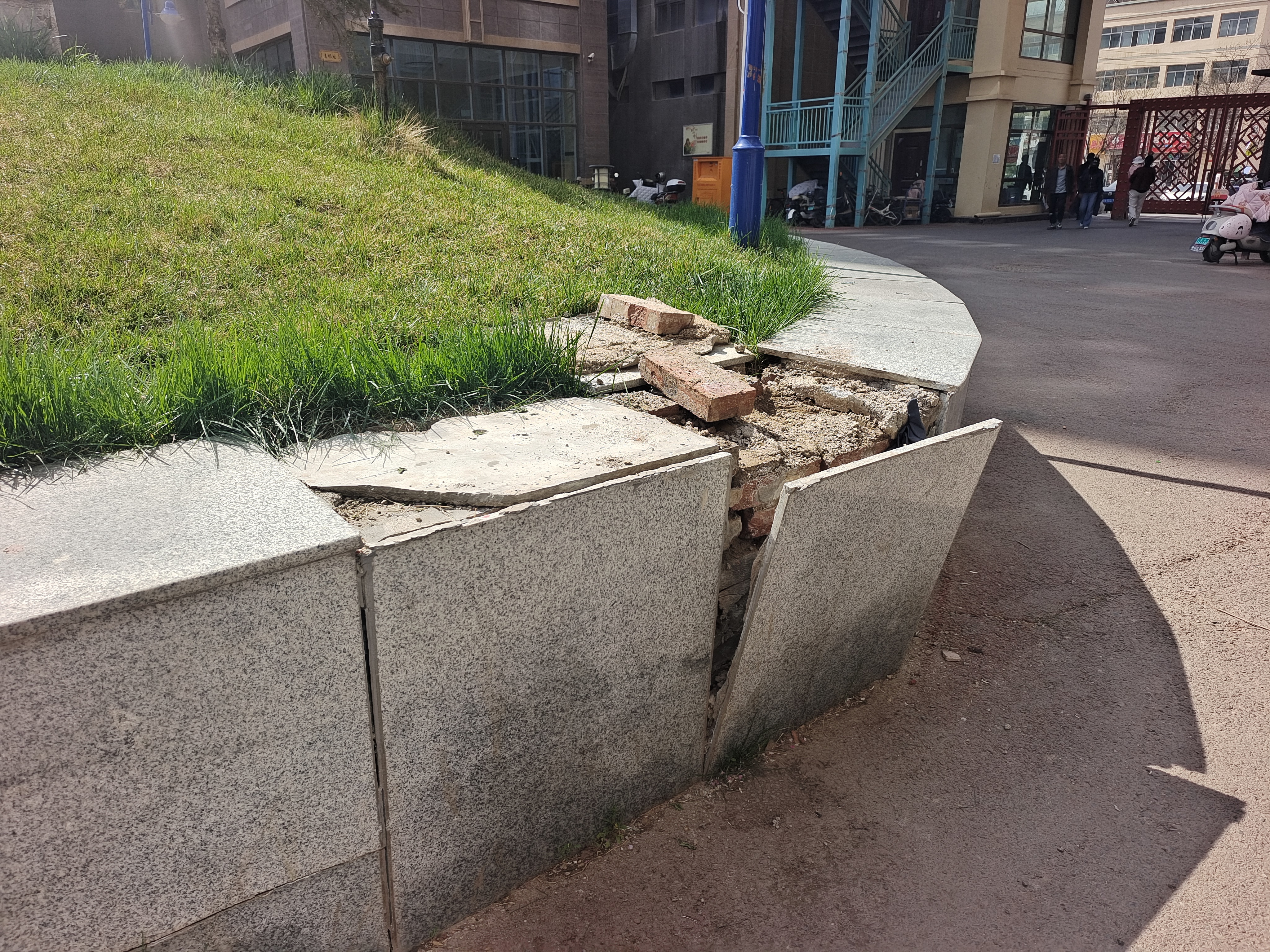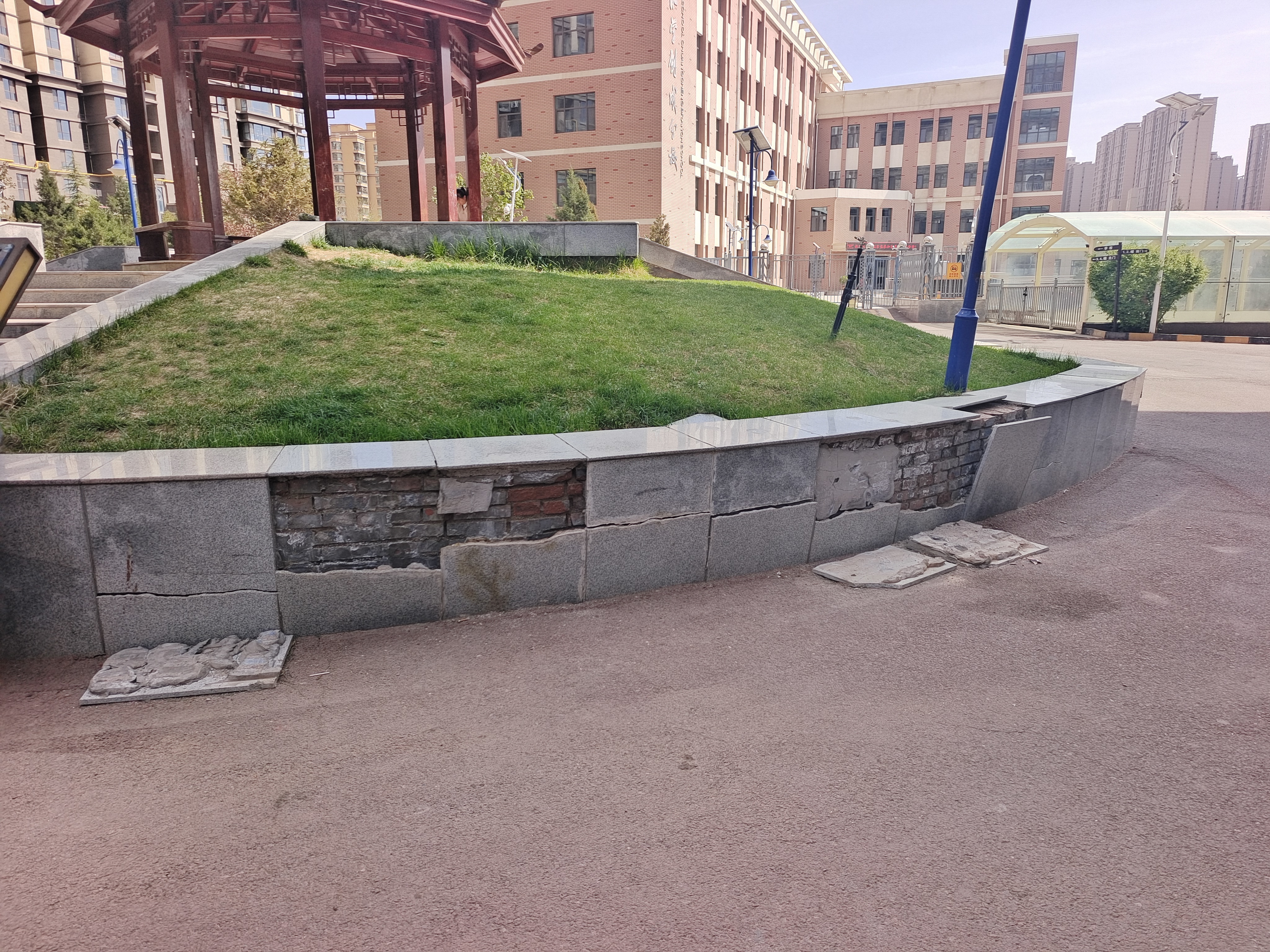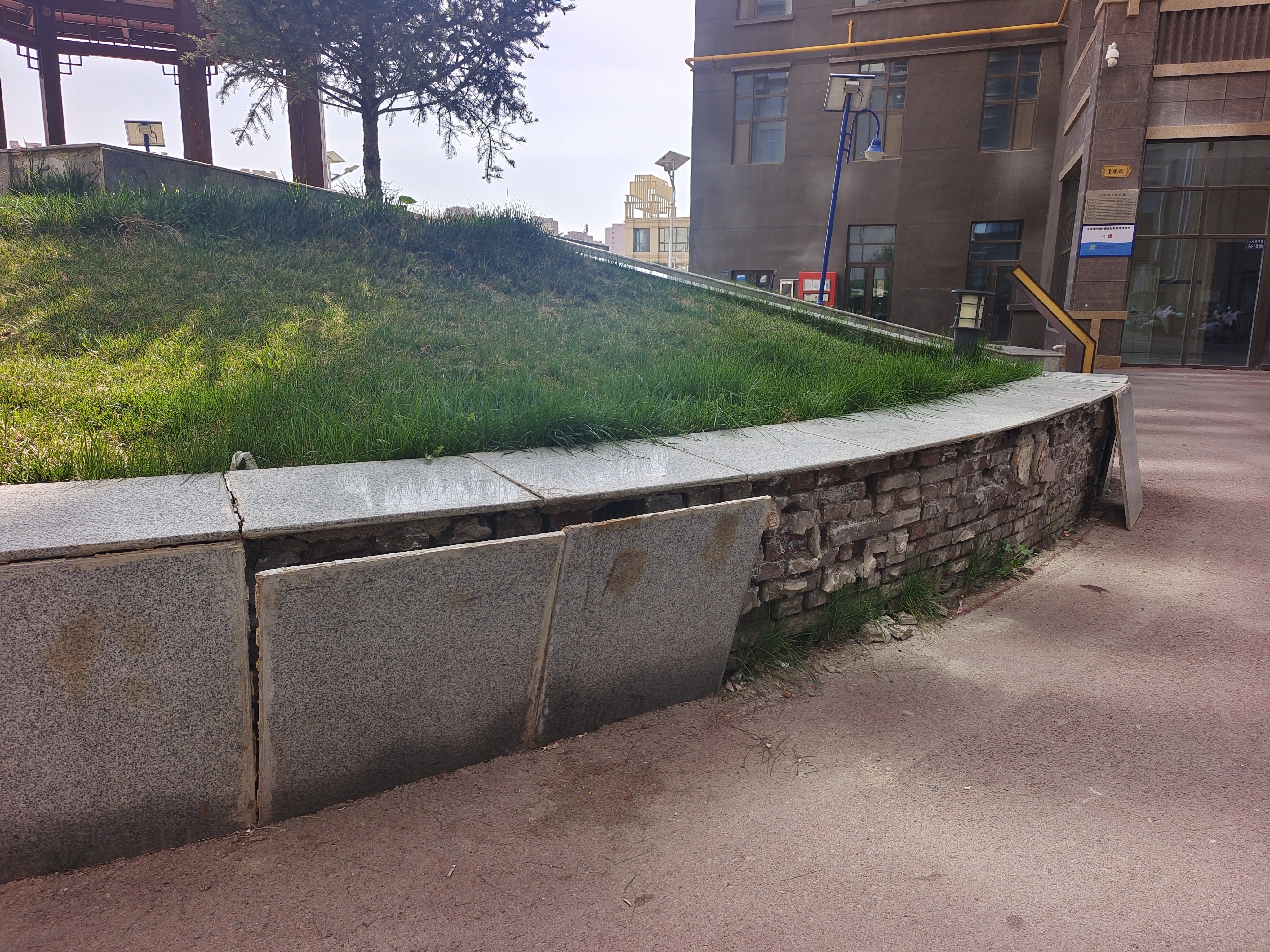 4月14日上午,记者来到龙江郡小区看到,现场情况确如业主描述:小区进门处带凉亭的景观花坛瓷砖大面积脱落、碎裂、空鼓,边缘残缺不全,水泥基层裸露风化,多处边角尖锐锋利。正大门入口处地面出现大面积下沉、凹陷,与原路面形成明显高度差,车辆出入、停放时车身出现倾斜,如同“陷在坑里”,车轮易剐蹭、底盘易磕碰。受地面沉降影响,一旁的路灯随时有倾倒风险。种植松树的花池整体歪斜、错位,池体与地面接缝连接处开裂,侧面直观可见地基下陷。