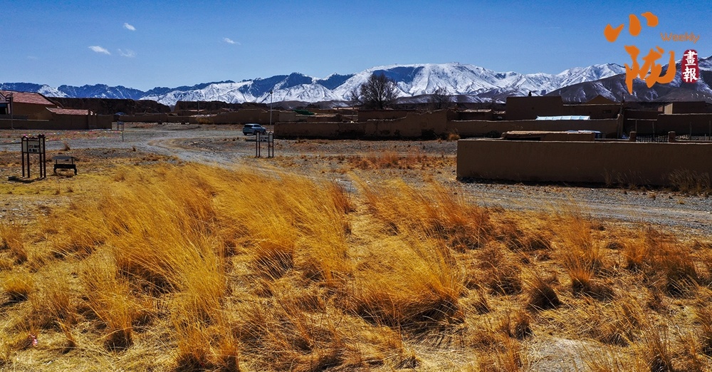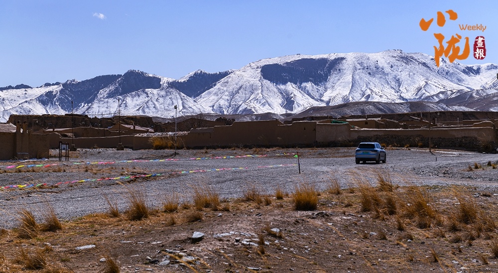 荒草漫过碎石地,土坯院落静卧在旷野,远处雪峰覆着皑皑白雪,澄澈蓝天作底。一辆车停在空地上,彩色经幡在风里轻晃,为苍茫的高原村落添了灵动的烟火气。