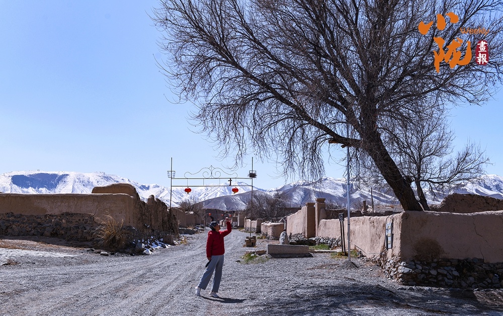 古村巷陌,藏着岁月沉淀的温柔。土坯墙围起旧时光,枝桠疏朗的老树斜立路旁,远处雪峰在晴空下泛着清辉。红衣旅人抬手轻触枝桠,为这片沉静的乡土,添上一抹鲜活的暖意。