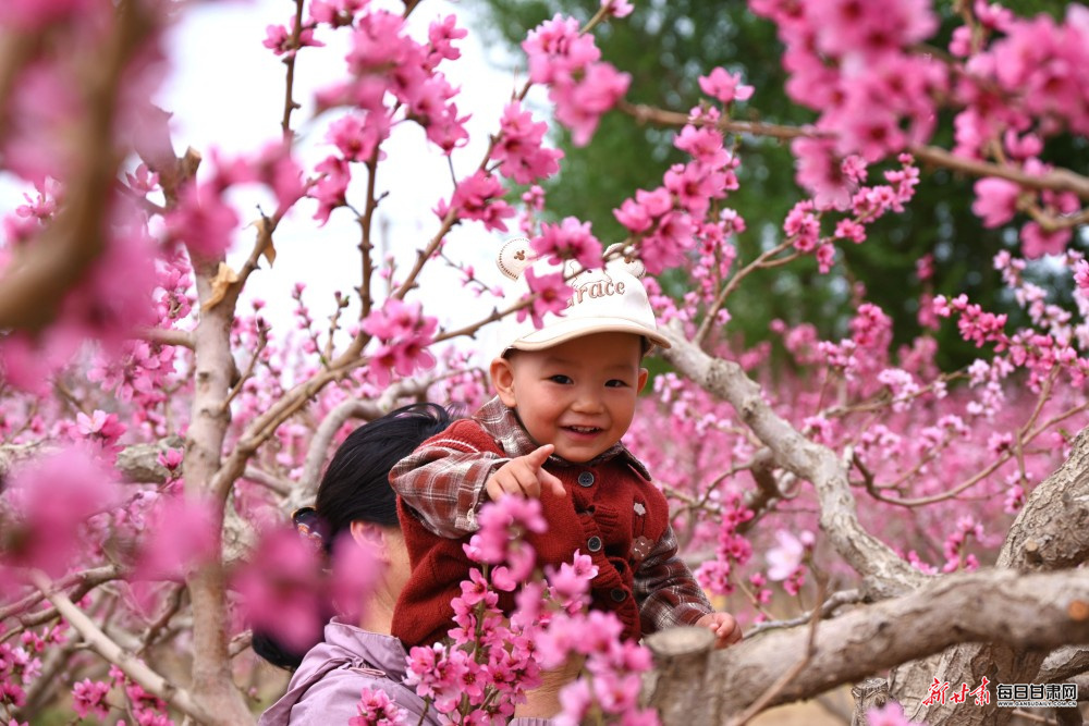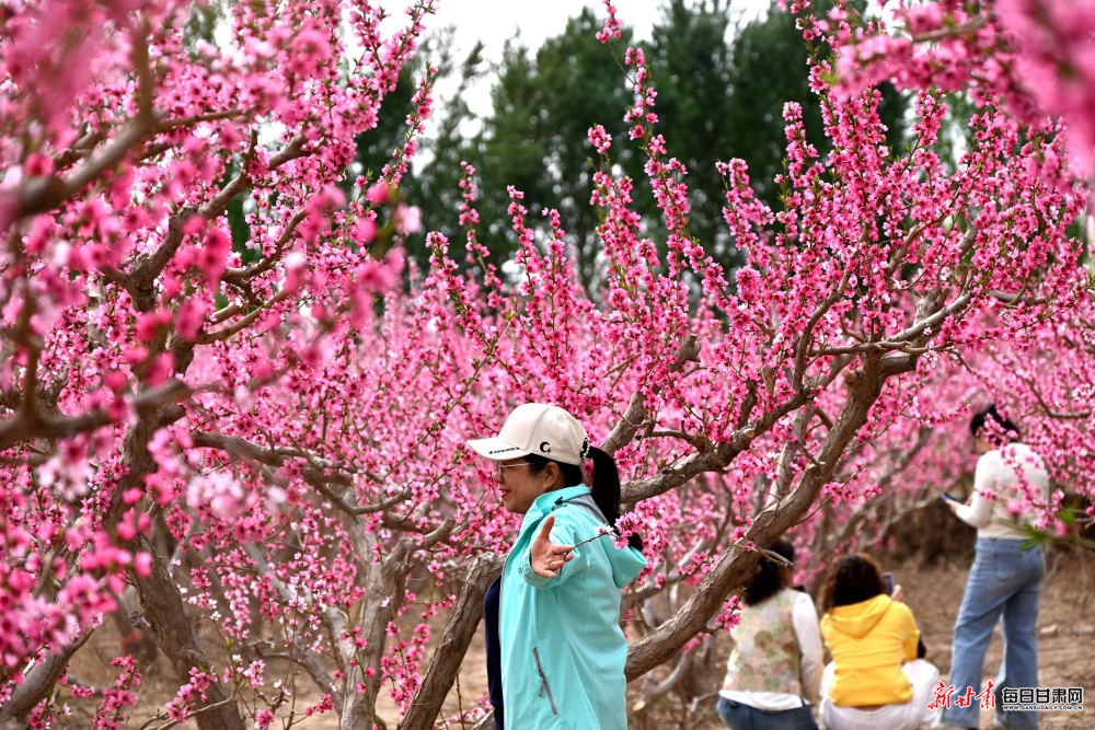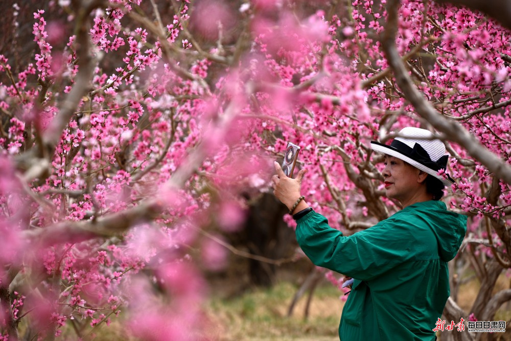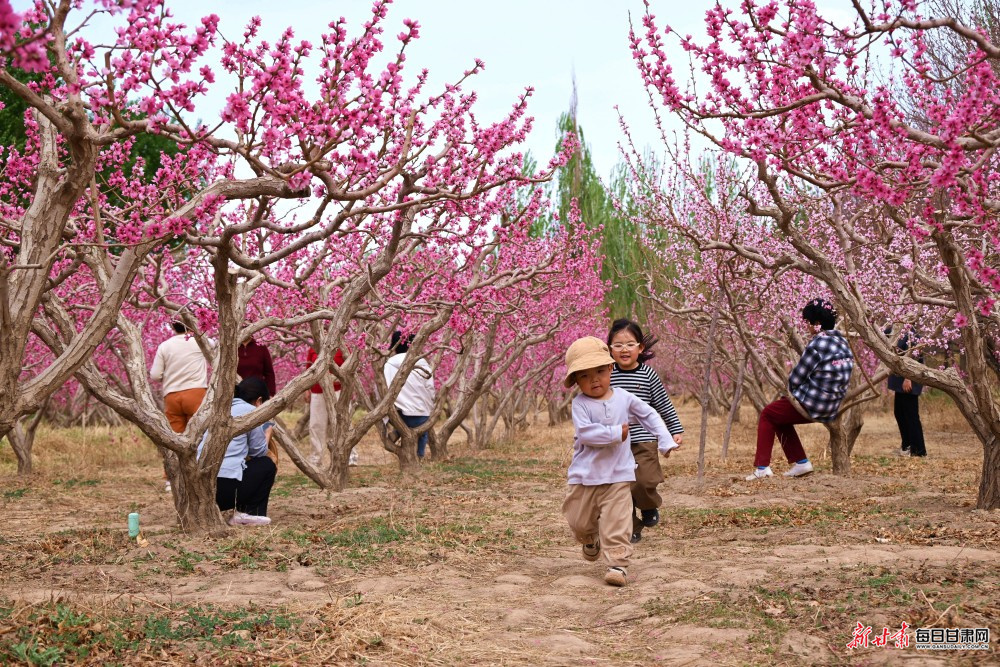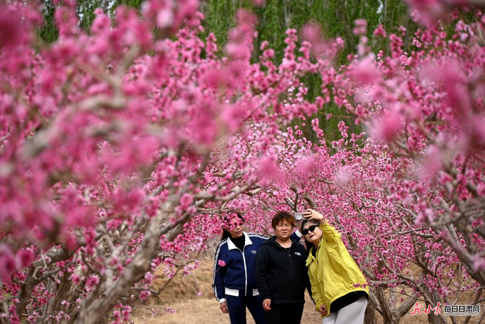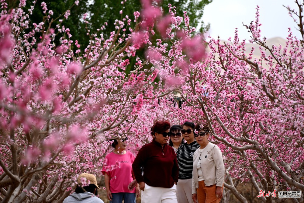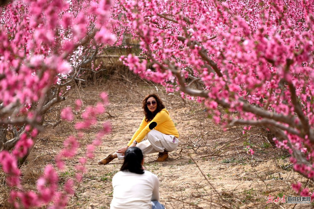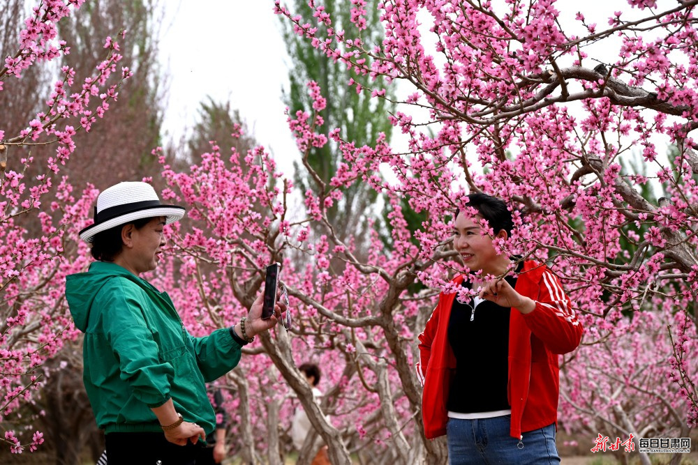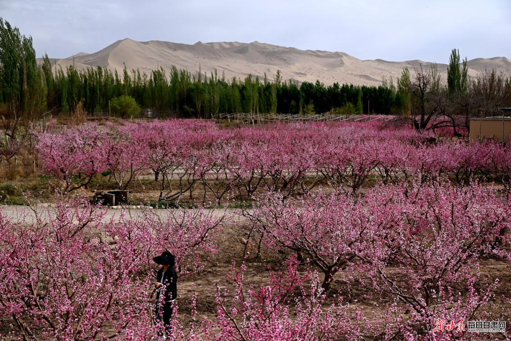 盛开的桃花吸引不少市民和游客前来踏青赏花、拍照打卡,人们漫步桃林之中,尽享大漠春光,感受别样的丝路浪漫。