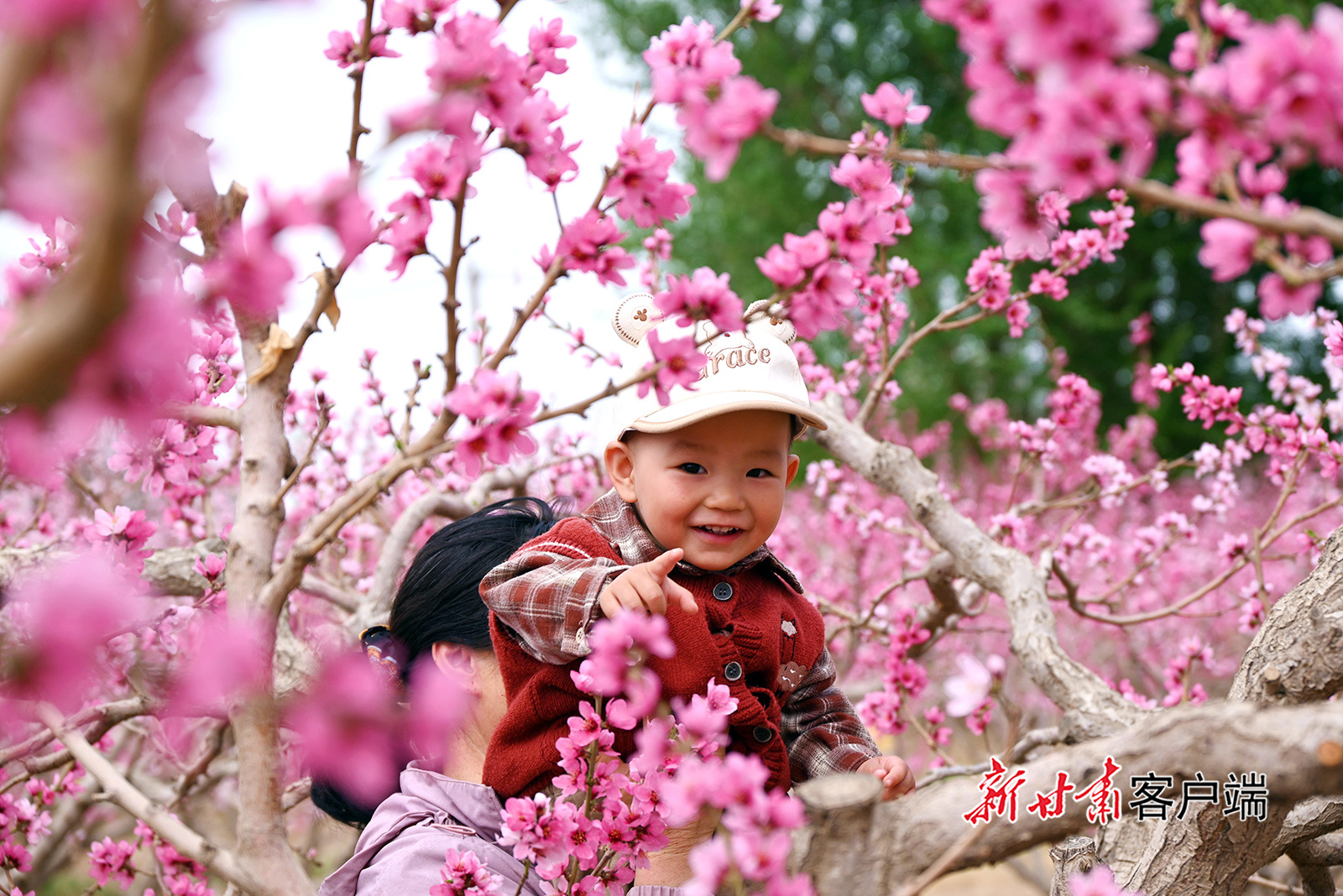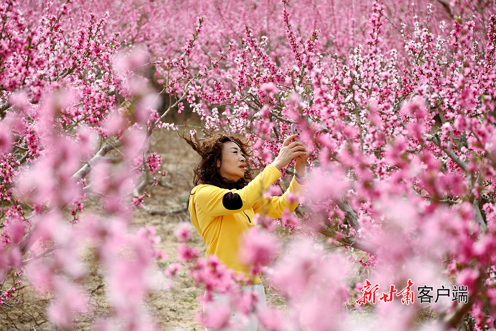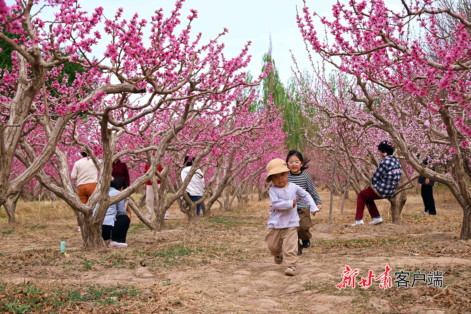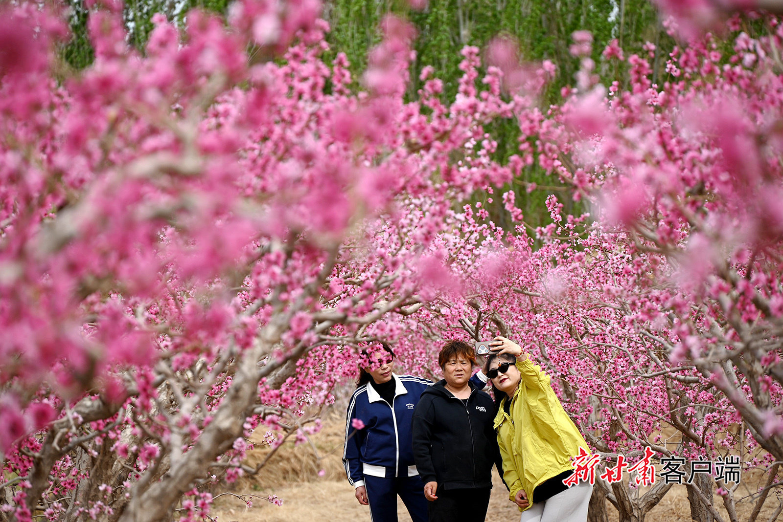 4月12日,游人在敦煌市七里镇桃产业示范基地游玩。日前,位于鸣沙山下的七里镇桃产业示范基地的桃花竞相绽放,吸引市民游客踏青赏花、乐享春光。