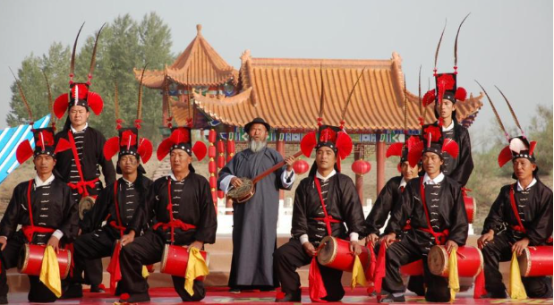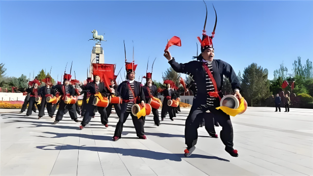 作为古代出征乐舞的活态传承,“阵形”是凉州攻鼓子的灵魂。当几十甚至上百名鼓手同时登场时,场面极为壮观。他们两人一对,八人为一组,不断变换出“猛虎出山阵”、“四门兜底阵”、“八卦连环阵”等复杂的军事阵法。在“咚咚哒咚”的激昂鼓点中,鼓手们脚下划着八卦步,手中的鼓槌上下翻飞,队列时而合拢如铁桶,时而散开如鹰翼。这种通过肢体和队列演绎的“不战而屈人之兵”的气势,正是凉州作为古代边塞要冲的尚武精神的体现。