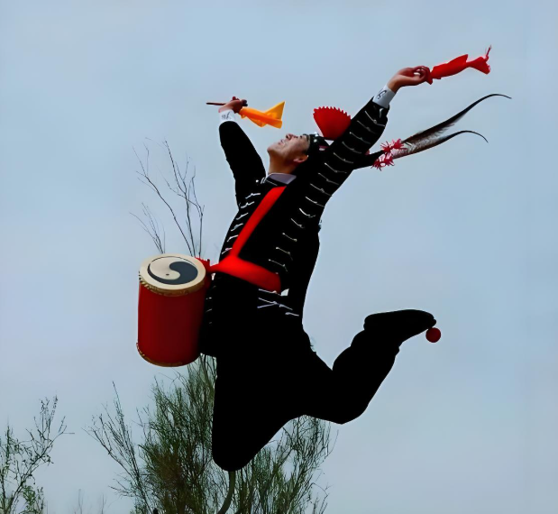 凉州攻鼓子的表演极具视觉冲击力,被形象地称为沙漠里的“黑旋风”。表演者均为男性,身穿黑夸衣、黑色灯笼裤,着黑色快靴,头戴黑幞帽,帽插两根野鸡翎,帽边还缀满了白色的纸花,这种黑白分明的装束显得既神秘又威武。他们腰挎红色的桶状鼓,双手紧握用红柳木制成的鼓槌。起舞时,鼓手们遵循“双手胸前画弧线,交错击鼓轮换翻”的口诀,动作刚劲有力,跨步、跃起、转身都带着一种古代武士的剽悍与决绝。