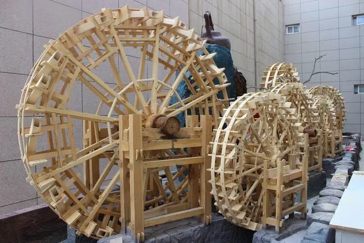 水车制作的精髓在于榫卯衔接工艺,匠人纯手工完成凿眼、拉卯、做榫楔等工序,运用斜榫、套通卯等独特技法,将上百个木构件精准拼接,仅靠木楔固定,无需金属配件,便能让结构稳固牢靠。完整的黄河大水车轮径可达16至20米,由主轴、辐条、刮板、水斗、支架组成,依靠黄河水流冲击刮板带动轮盘转动,水斗舀水注入渠中,实现无动力自流灌溉,既体现了顺应自然的农耕智慧,也暗含黄河儿女坚韧务实的处世哲学。