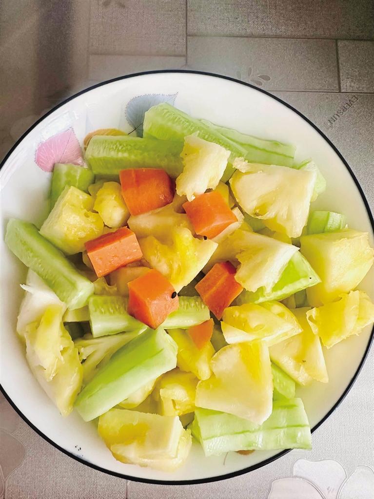 美优美佳超市内,新进菠萝按产地分区销售,工作人员正现场削皮分装,零售价每斤11.9元至14.8元。另一边的现切鲜果专柜里,小菠萝、分切大菠萝已打包完毕。“最近菠萝卖得特别好,很多市民觉得整颗太大,按需购买分切装更方便。”超市工作人员介绍。蔬菜区内,黄瓜摆在最醒目的位置,其1.98元/斤的零售价吸引不少市民选购。