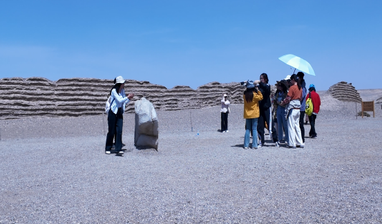 在阳关遗址,师生们驻足关城、烽燧遗迹间,以实景为教材、以遗迹为载体,结合敦煌文献与史地知识展开自主观察、互动交流、研讨学习。作为古代丝绸之路南道的咽喉要冲,阳关承载着中西文明交融的厚重记忆,师生们从地形地貌分析其军事防御与商贸枢纽功能,从遗址格局感知历史的层累变迁,在实景中深化对丝绸之路交通体系、边疆治理的理解。