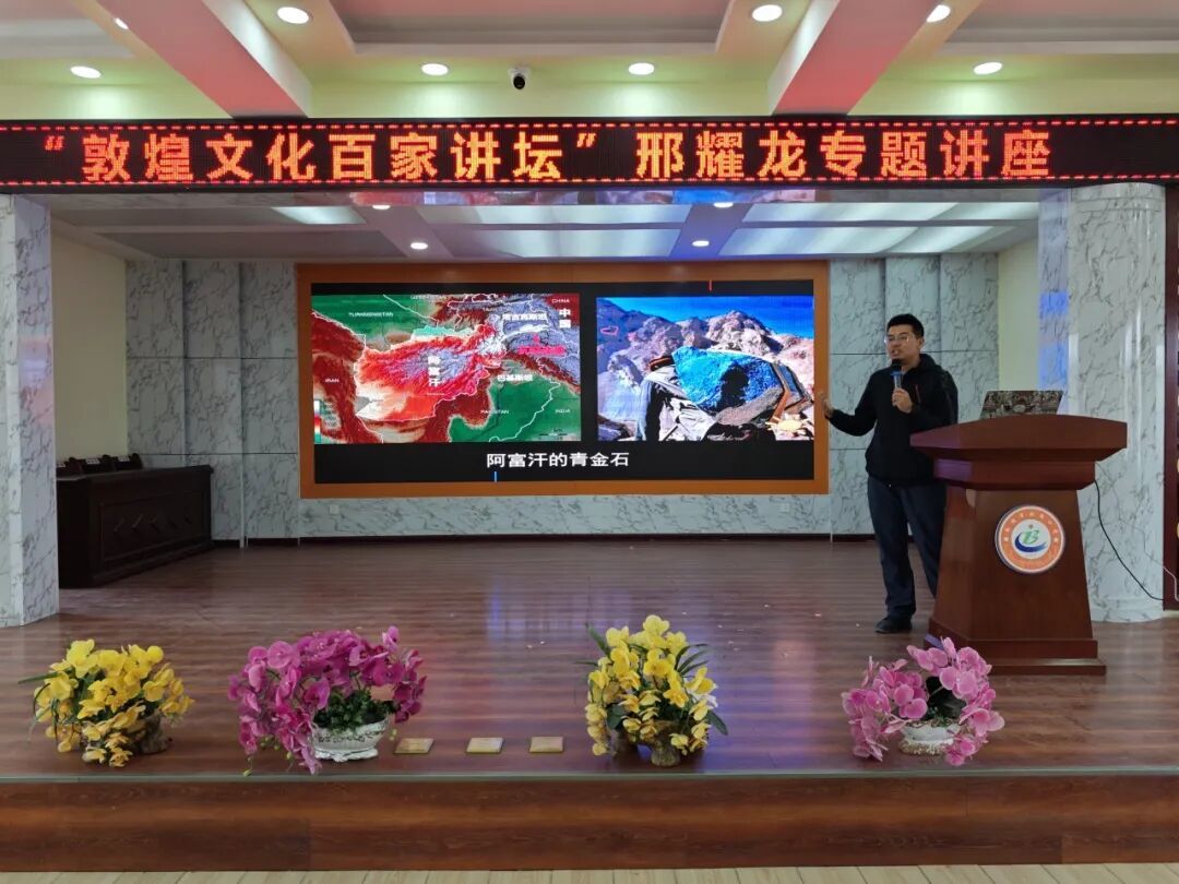 在同学们的阵阵掌声中,邢耀龙老师开始了当天的讲座。邢老师从探寻敦煌石窟壁画的色彩来源、文化内涵及历史价值三个方面讲述石窟里的敦煌色。敦煌是丝绸之路核心枢纽,莫高窟与榆林窟等共同构成跨越千年的文化丰碑,是全人类共同的精神财富。唐代时敦煌元宵灯会排名全国第二,彰显了其当年的繁盛与辉煌。邢老师以“无颜色的金刚寻色”为故事线,串联各颜色的由来——三危山的绿色颜料矿、阿富汗经丝绸之路传入的青金石,阳关诗人赠予的墨(黑色)、道士炼丹用的朱砂(红色)、市集贝壳研磨的白色、酒泉(原名金泉)及瓜州地区的黄金色(黄色)。在此基础上还为同学们讲述了颜料制作过程:矿石磨粉→过滤沉淀→混合桃胶(增强附着力)。最后讲述了丝绸之路上最核心的交通工具是毛驴而非骆驼,驴肉黄面的由来也印证这一点,同时,邢老师也强调敦煌文化的时代价值,呼吁青少年成为文化的守护者、传承者,延续“敦煌第二”的辉煌,让中华文脉代代相传。