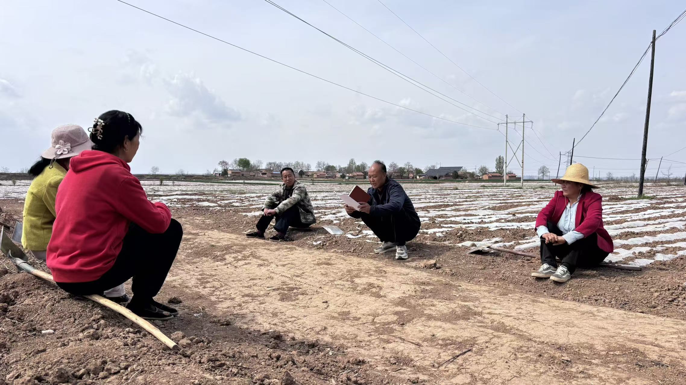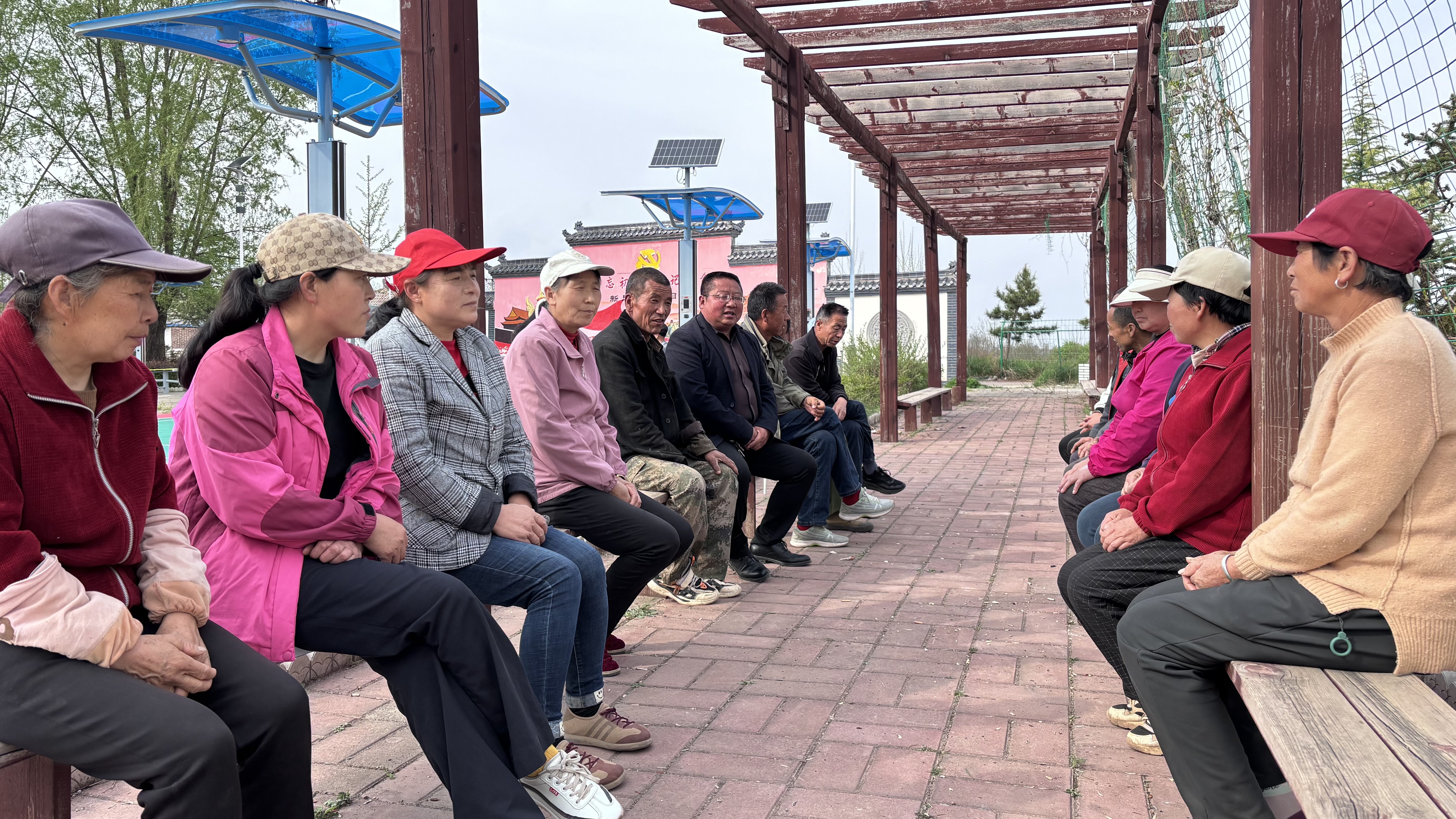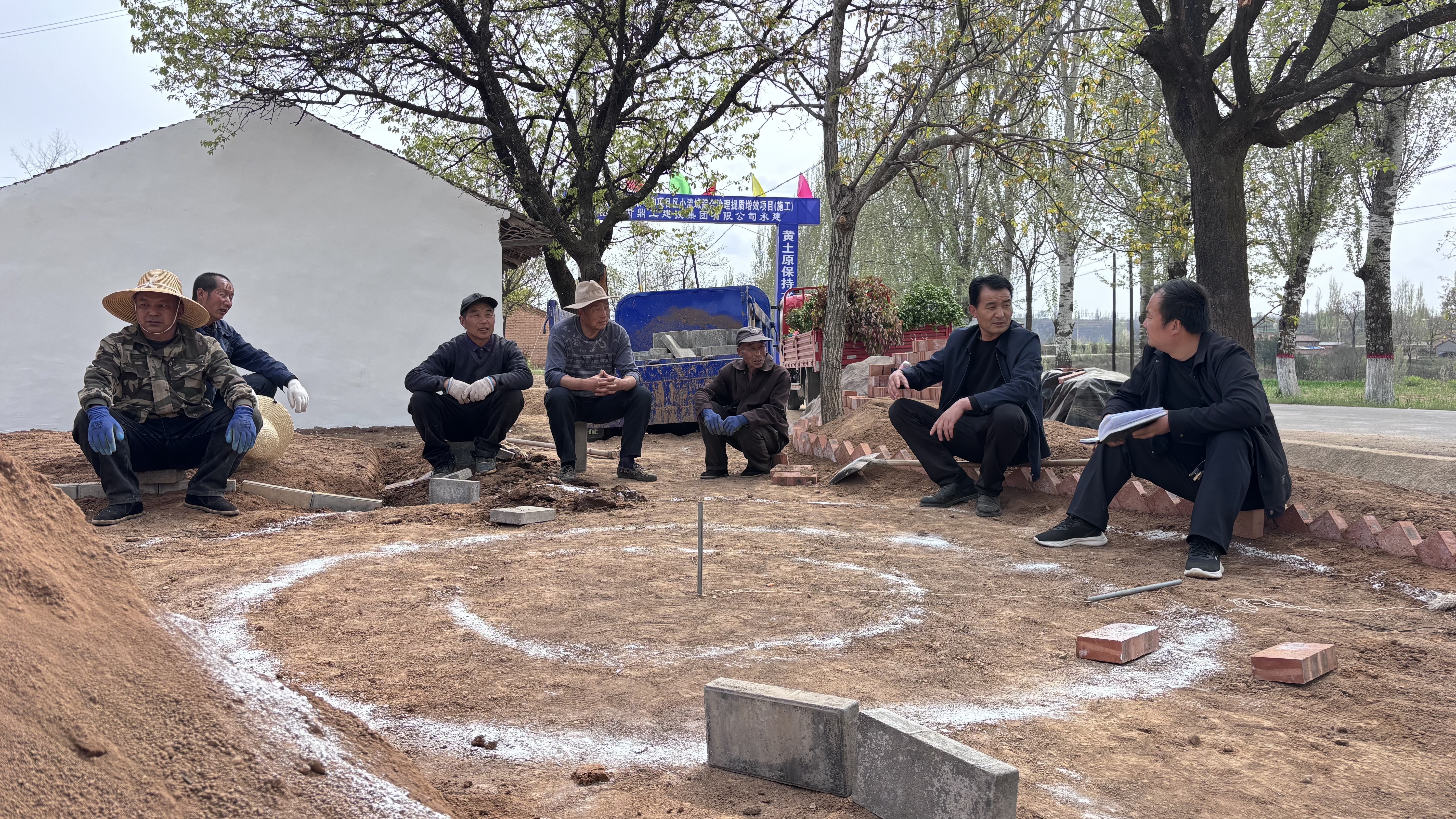 不止在议事亭,田间地头,房前屋后亦是“课堂”。在灵台县蒲窝镇韩家洼村的施工现场上,机器暂歇,尘土轻扬。村党支部书记周健与几位村民围拢而来,席地而坐,这里便成了临时的“议事堂”。从宅基地改造的细节,到配套设施的布局,大家你提想法,我补建议,村里发展的蓝图,就在这尘土与风声中,一点点勾勒、敲定。