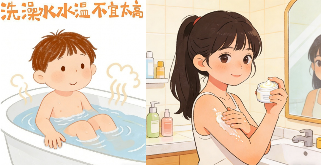 使用温水沐浴,避免热水烫洗和刺激性强的洗浴用品。每天多次厚涂润肤霜十分关键,不仅能保持皮肤湿润而且能降低皮肤敏感性,为皮肤穿上一层“保护膜”。
