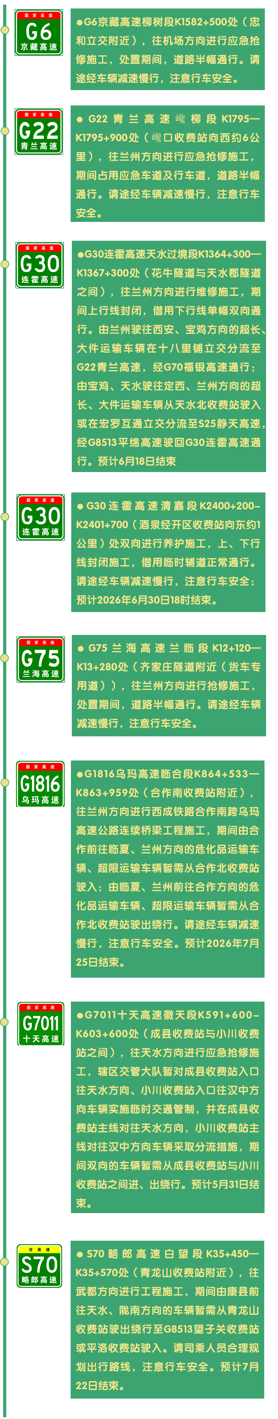 ▶3.如需了解最新路况信息可直接拨打交通运输服务监督电话12328咨询或关注甘肃高速官方抖音、快手、视频号、新浪微博、微信、今日头条以及甘肃高速APP了解。