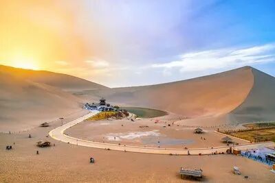 鸣沙山(敦煌)位于敦煌城南,国家5A级景区。因沙动有声得名,五色沙堆积成山,与月牙泉“沙泉共生”,“沙岭晴鸣”为敦煌八景之一。