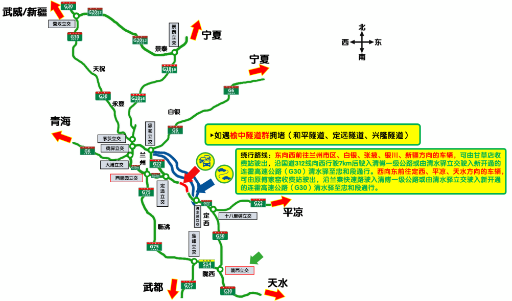 ▶如遇榆中隧道群拥堵(和平隧道、定远隧道、兴隆隧道)。