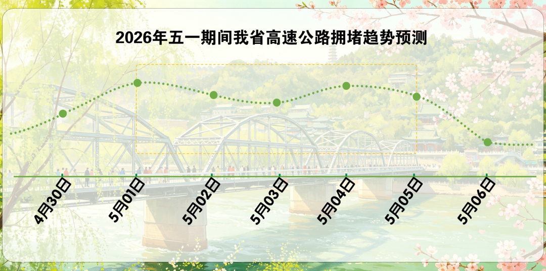 五一假期预计探亲流、旅游流、学生流呈现叠加态势。中短途自驾游为主流出行方式,且短途出行与跨省中长途出行交织,路网流量高位运行,整体呈现“多热点、满负荷、潮汐式、波段性”运行态势,易造成缓行和拥堵。