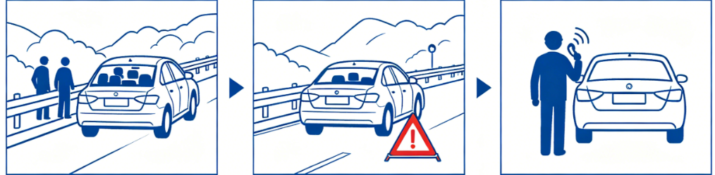 ▶2.如车辆行驶途中发生事故或故障,首先应确保人员安全,将车上人员转移至安全地带,在车后来车方向150米处做好安全预警,并立即拨打高速公路报警救援电话12122寻求帮助。