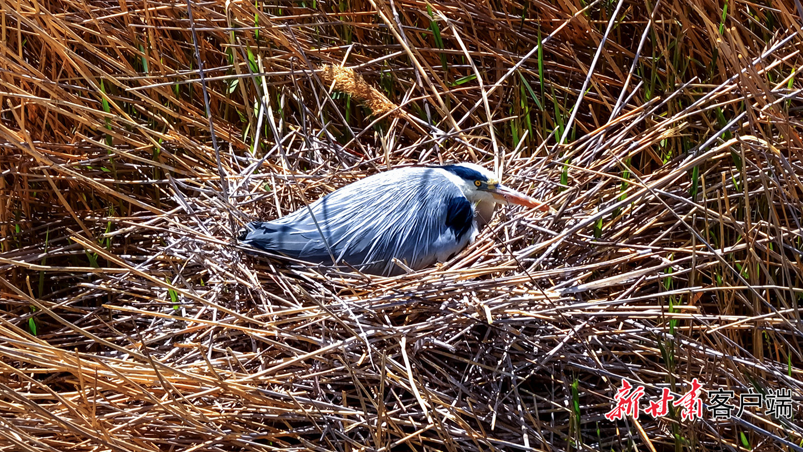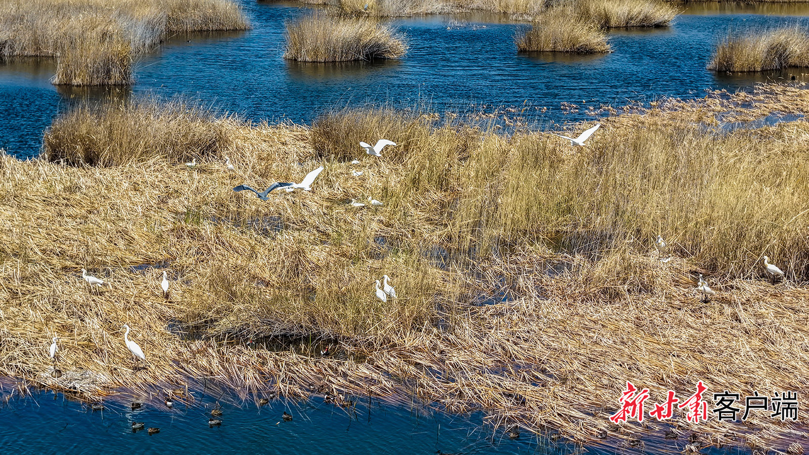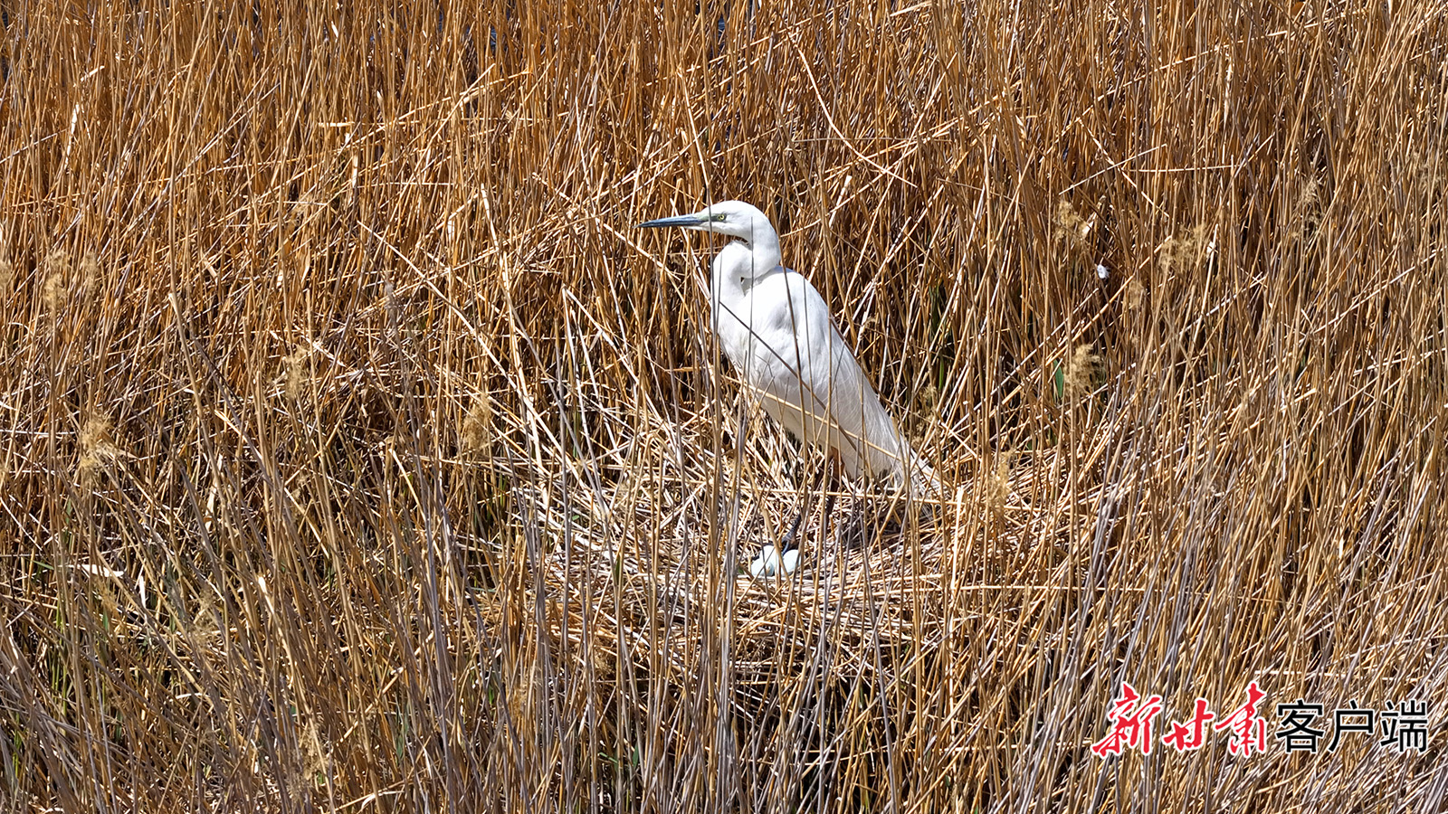 4月23日,民勤青土湖湿地春意盎然,白鹭、灰鹭等野生鸟类云集,在芦苇丛中筑巢孵蛋,一派生机勃勃的生态画卷。